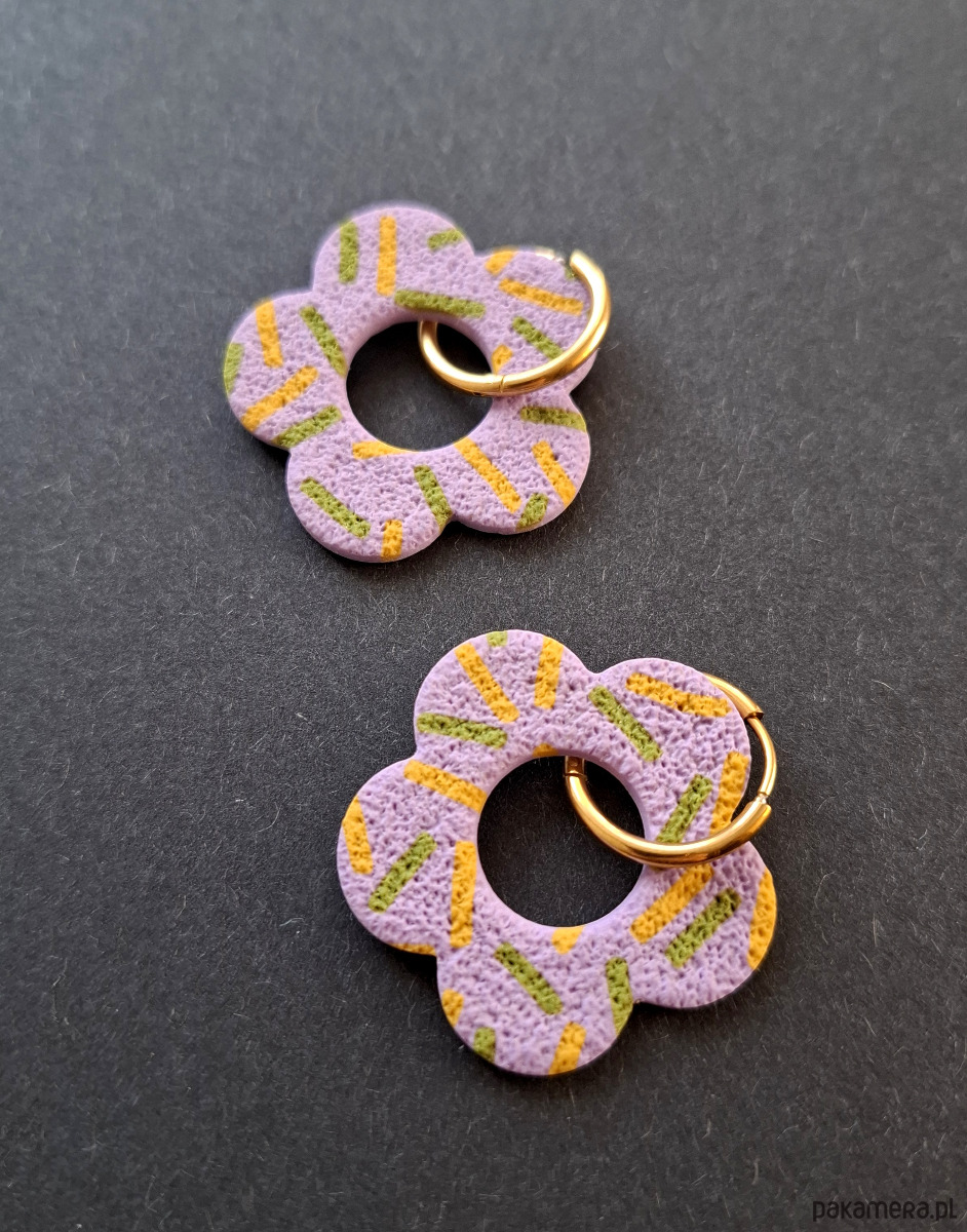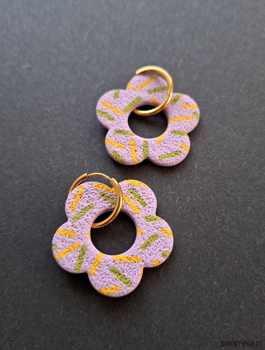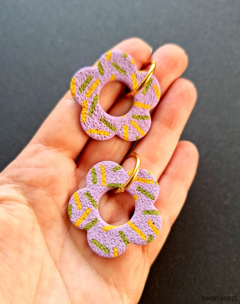 Kolczyki wiszące ręcznie wykonane z wysokiej jakości glinki polimerowej w wiosennej stylizacji. Bigle typu kajdanki - z zapięciem na zatrzask, pozłacane i nieuczulające ze stali szlachetnej. Kolczyki jednostronne i lekkie. Wymiary: długość całkowita - 4,2 cm, szerokość 3,5 cm. Wykonane w jedynym egzemplarzu.