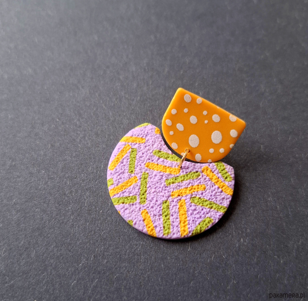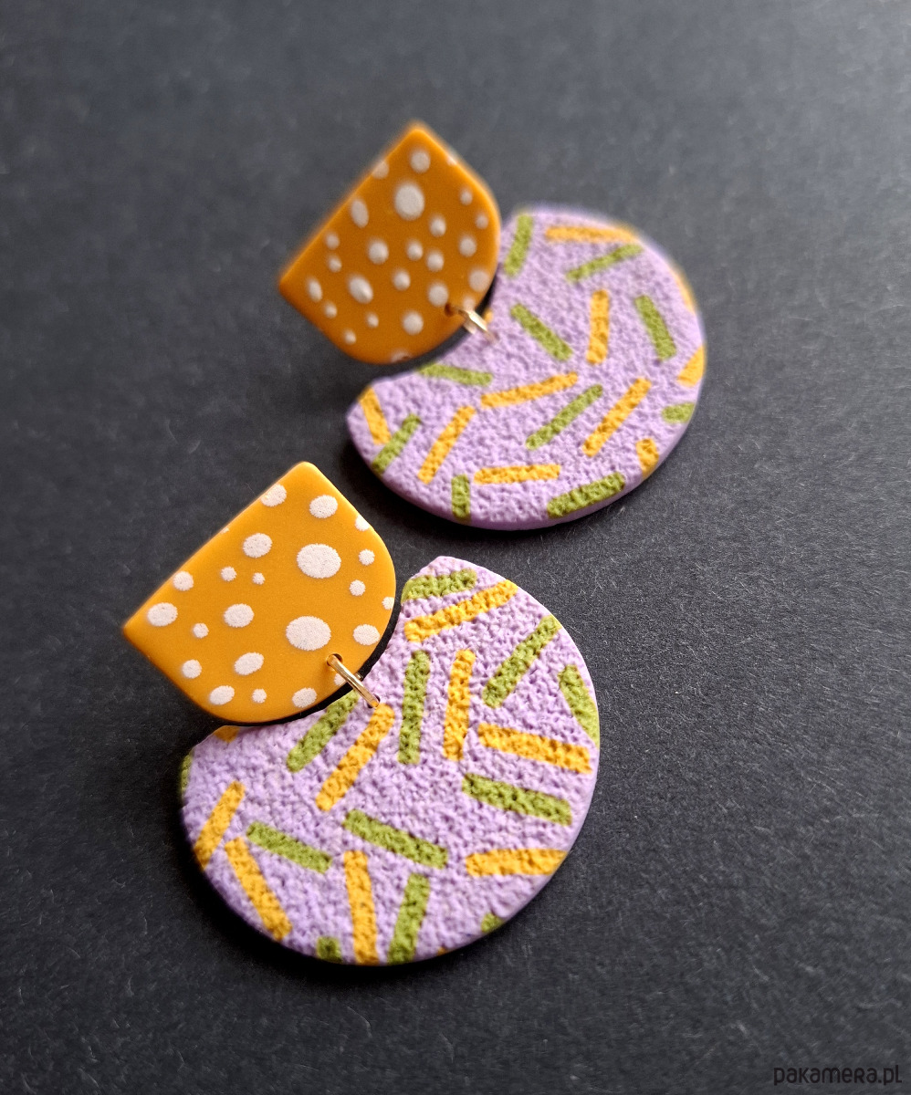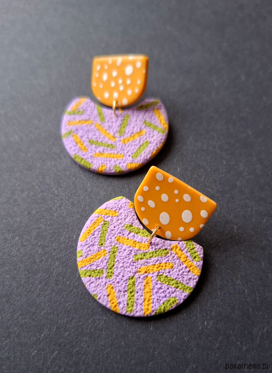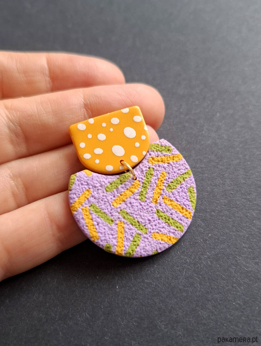 Lekkie kolczyki na sztyfty ręcznie wykonane z wysokiej jakości glinki polimerowej z efektownym wzorem - połączenia kropek i kolorowego konfetii. Jednostronne z pozłacanymi, nieuczulającymi sztyftami i zapięciami na klasyczne baranki. Wymiary: długość wraz z zapięciem: 4 cm; szerokość max. 3,5 cm. Wykonane w jedynym egzemplarzu.