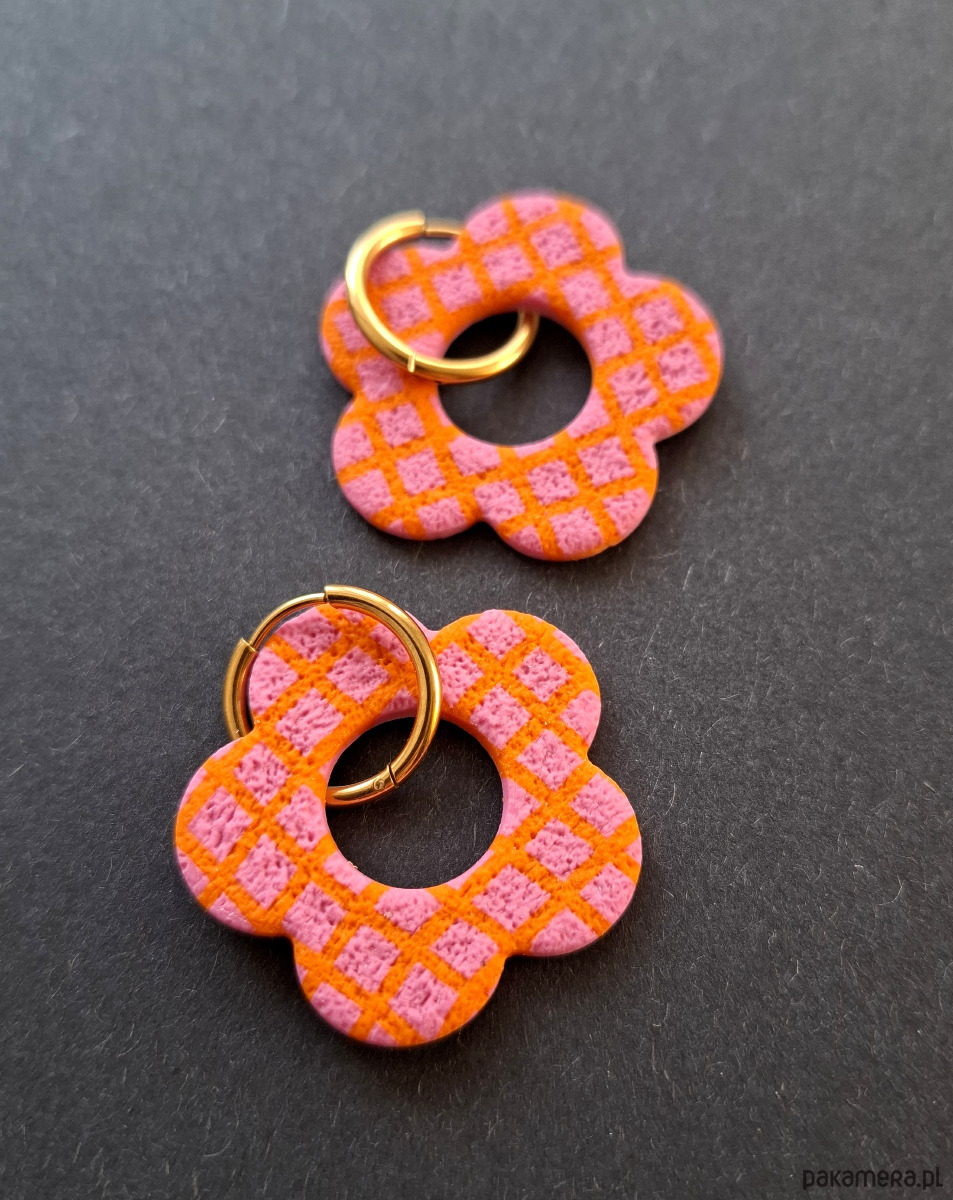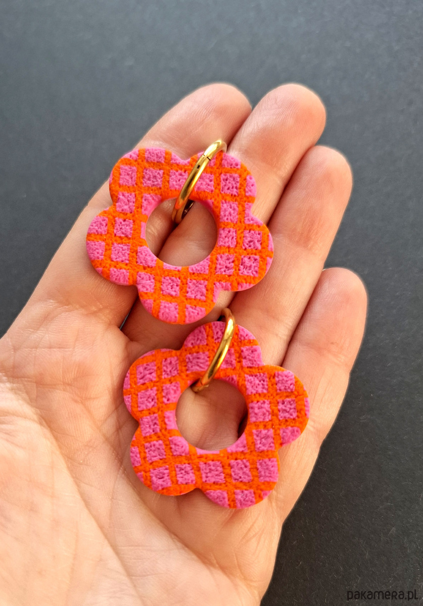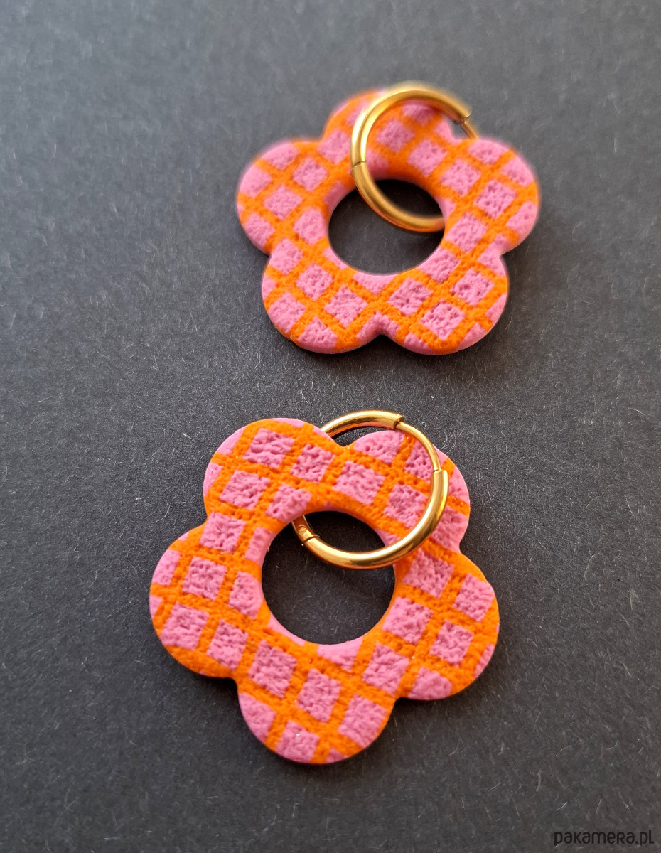 Kolczyki wiszące wykonane z wysokiej jakości glinki polimerowej w kolorach różu i pomarańczy. Bigle typu kajdanki - z zapięciem na zatrzask, pozłacane i nieuczulające ze stali szlachetnej. Kolczyki jednostronne i lekkie. Wymiary: długość całkowita - 4,2 cm, szerokość 3,5 cm. Wykonane w jedynym egzemplarzu.