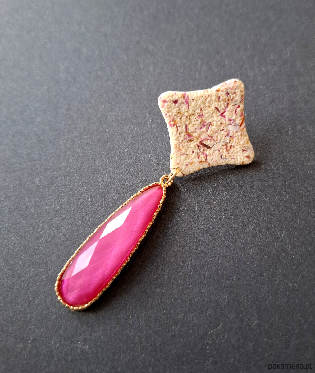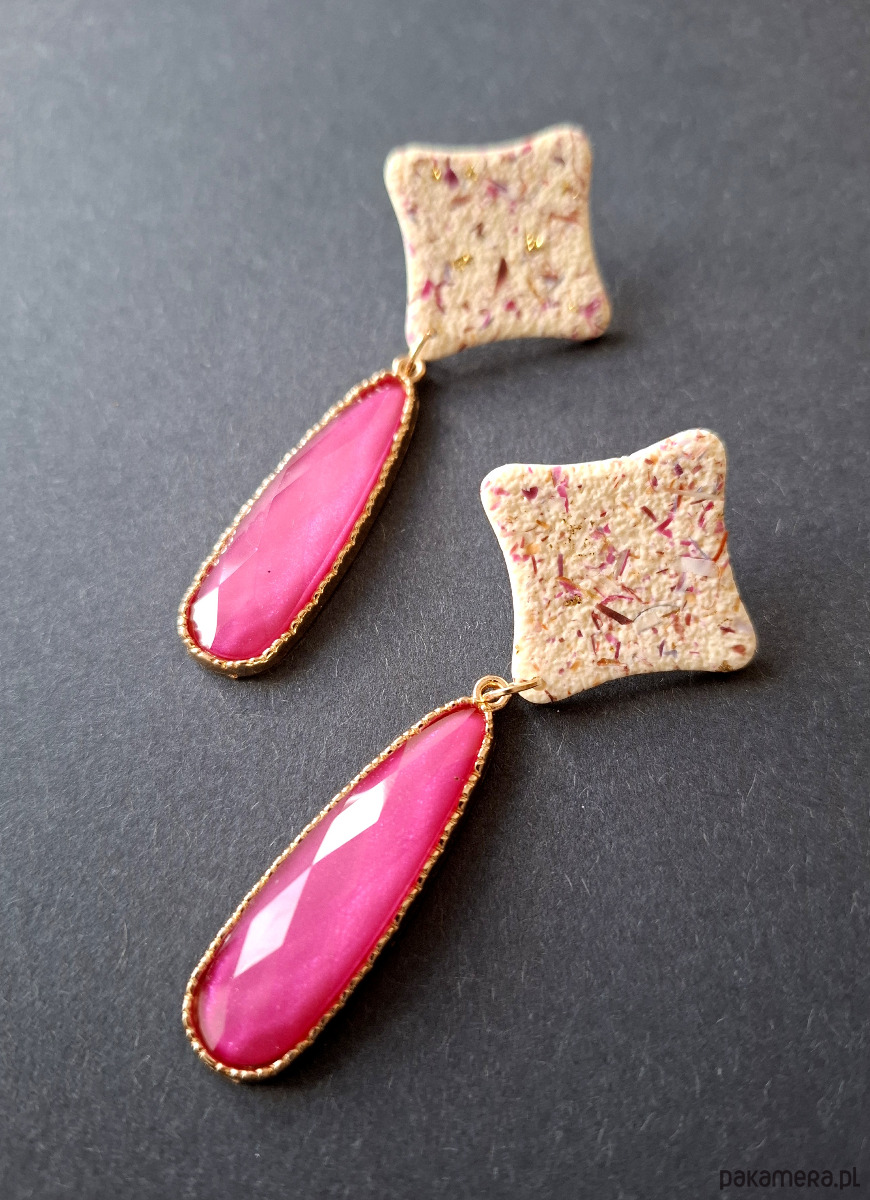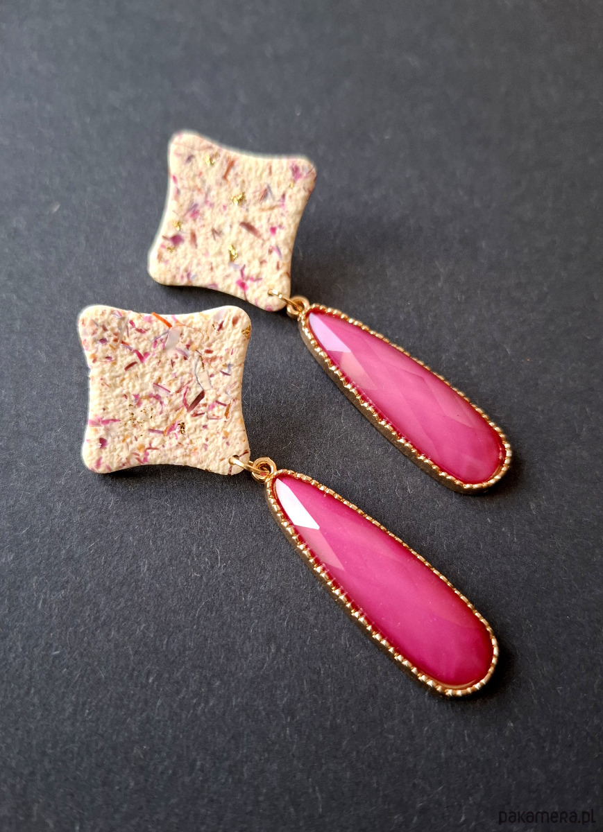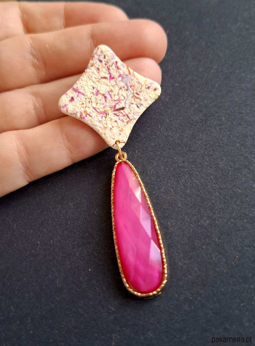 Lekkie kolczyki na sztyfty wykonane z wysokiej jakości glinki polimerowej z dodatkiem ozdobnych elementów akrylowych w różowym kolorze. Jednostronne z pozłacanymi, nieuczulającymi sztyftami z klasycznymi barankami. Wymiary: długość całkowita: 7,3 cm; szerokość max. 3 cm. Wykonane w jedynym egzemplarzu.