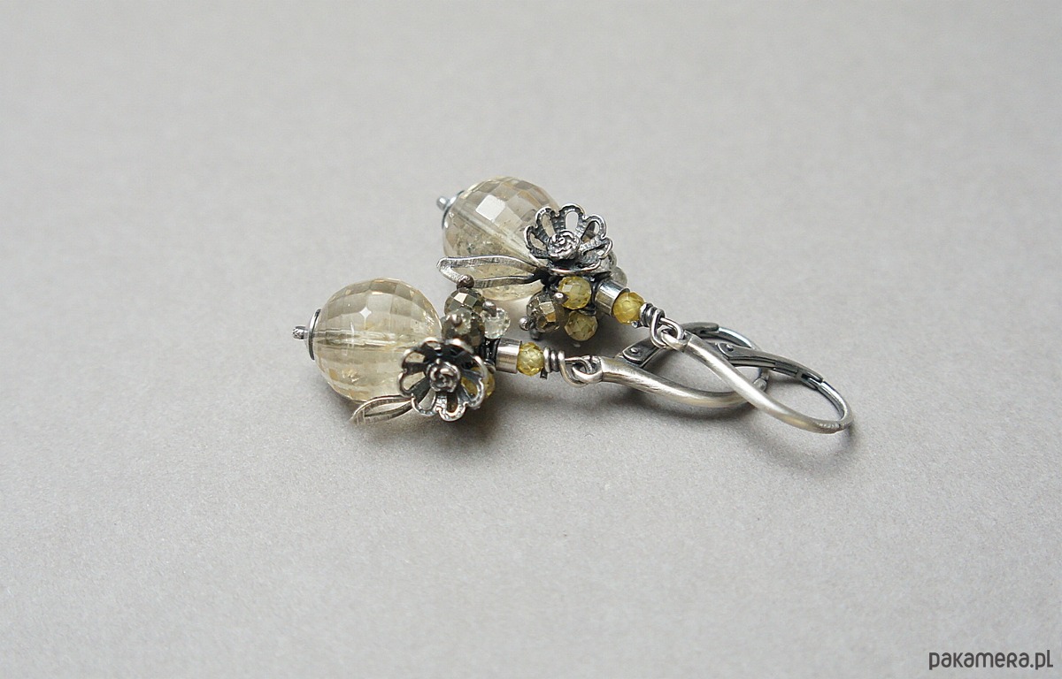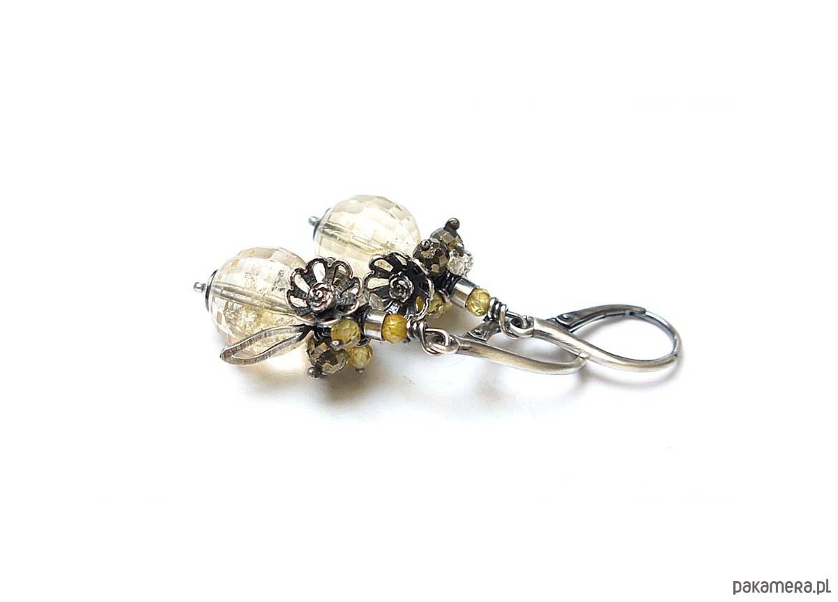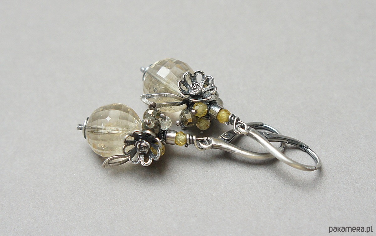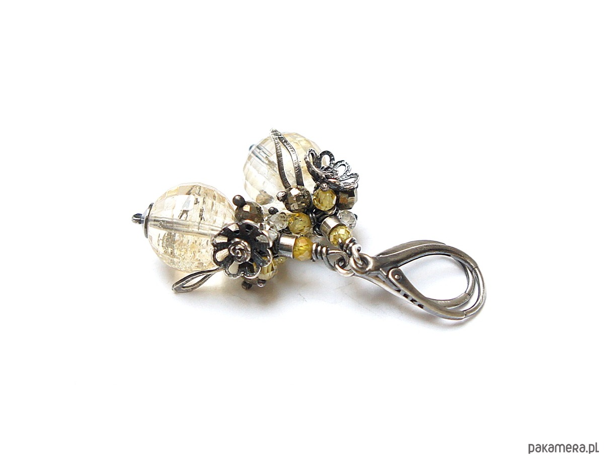 Kolczyki wykonane ze srebra [pr. 925] w połączeniu z wysokiej jakości fasetowanymi kuleczkami cytrynów [12mm klasa AA], fasetowanymi pirytami [4mm], cyrkoniami [3mm]. Całość oksydowana i przetarta. Całkowita długość kolczyków ok. 4,7cm. Biżuteria ozdobnie zapakowana.