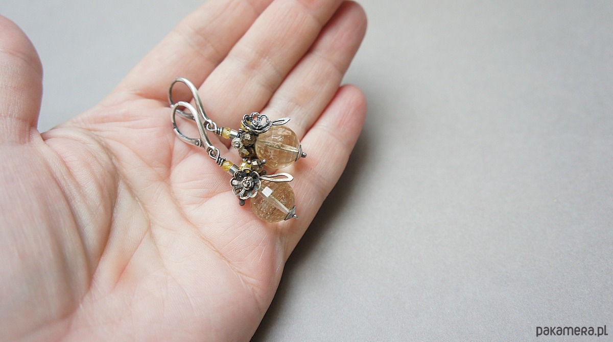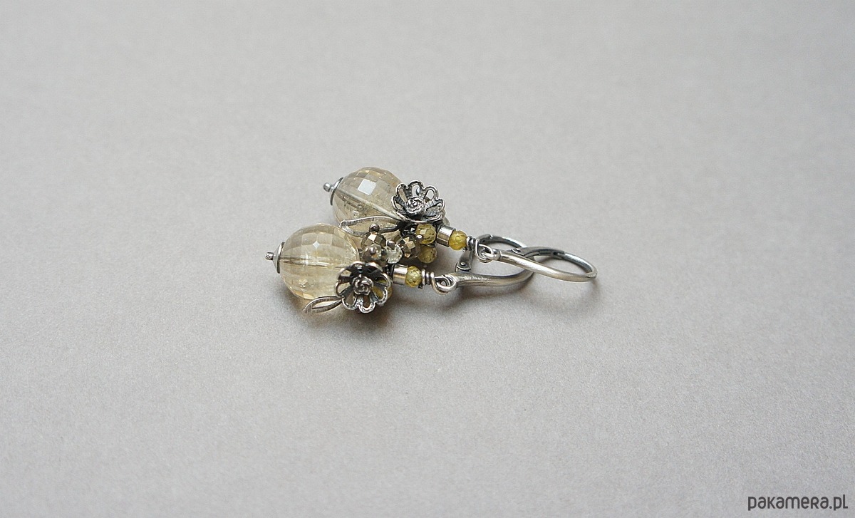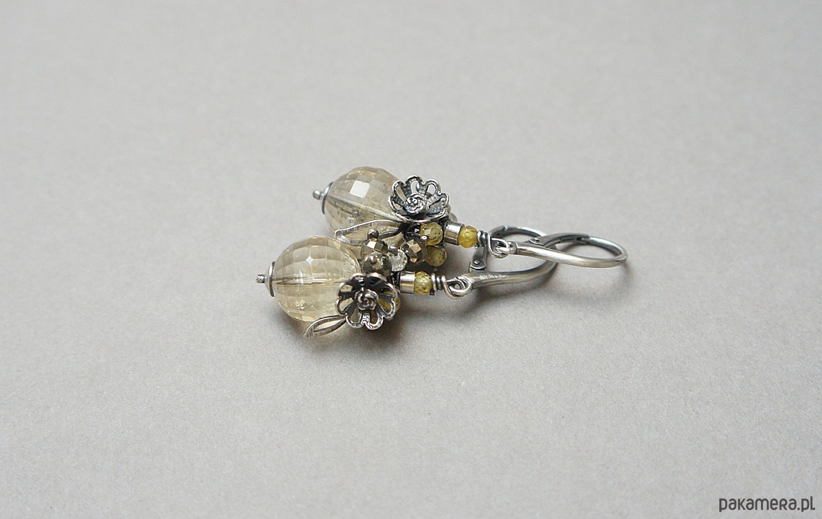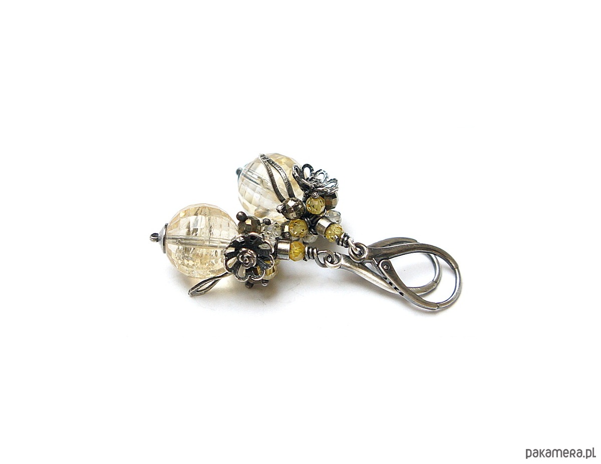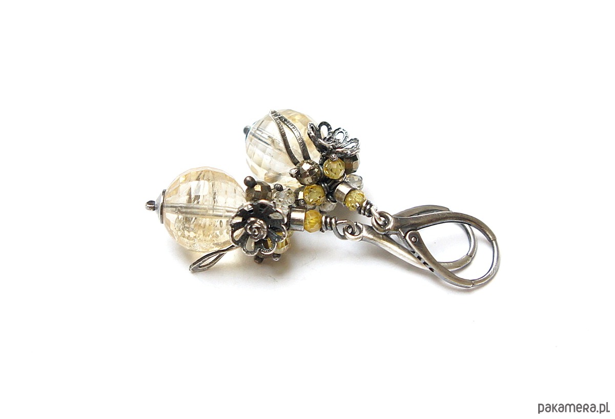 Kolczyki wykonane ze srebra [pr. 925] w połączeniu z wysokiej jakości fasetowanymi kuleczkami cytrynów [12mm klasa AA], fasetowanymi pirytami [4mm], cyrkoniami [3mm]. Całość oksydowana i przetarta. Całkowita długość kolczyków ok. 4,7cm. Biżuteria ozdobnie zapakowana.