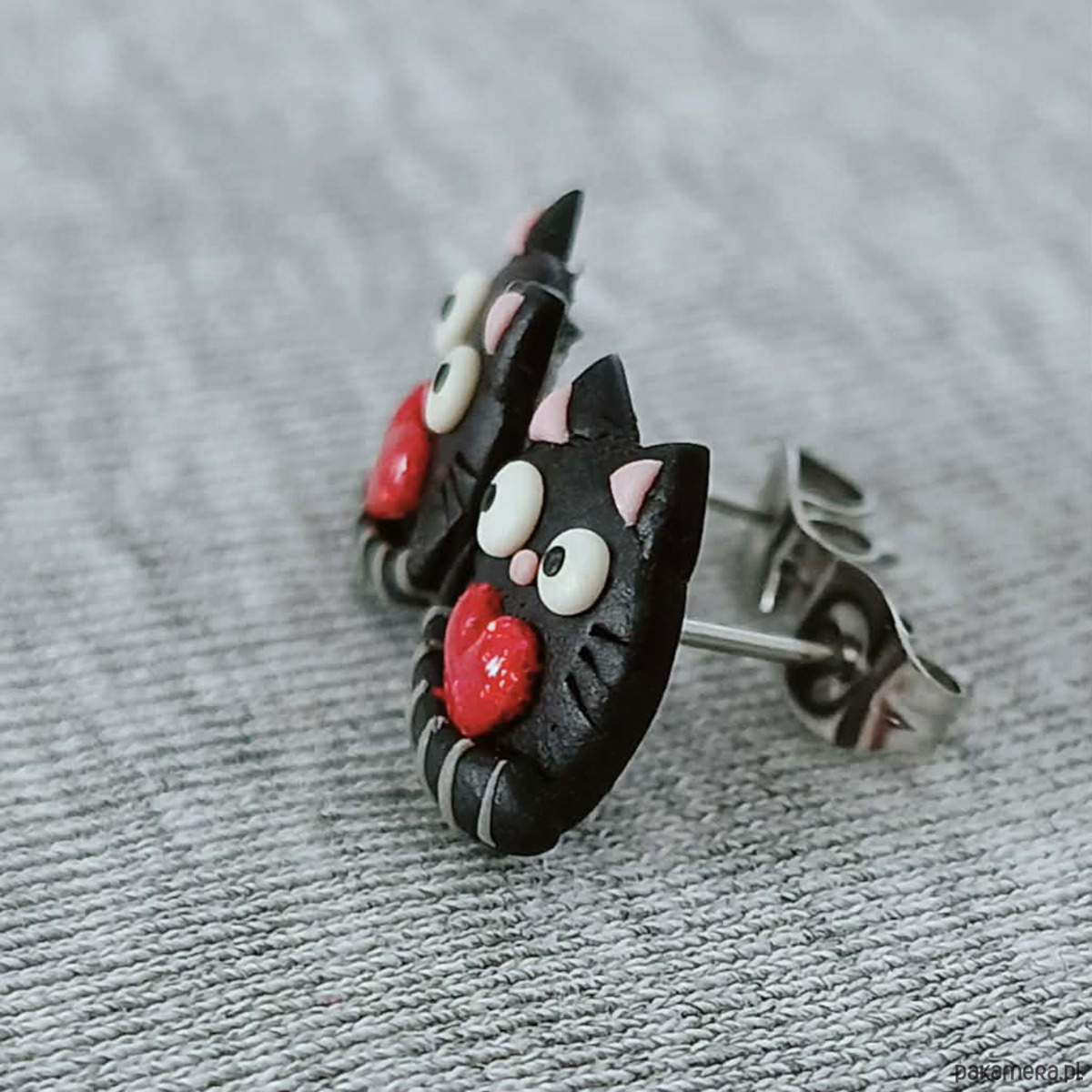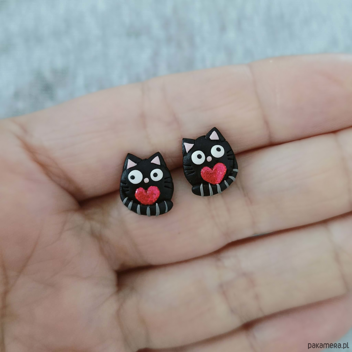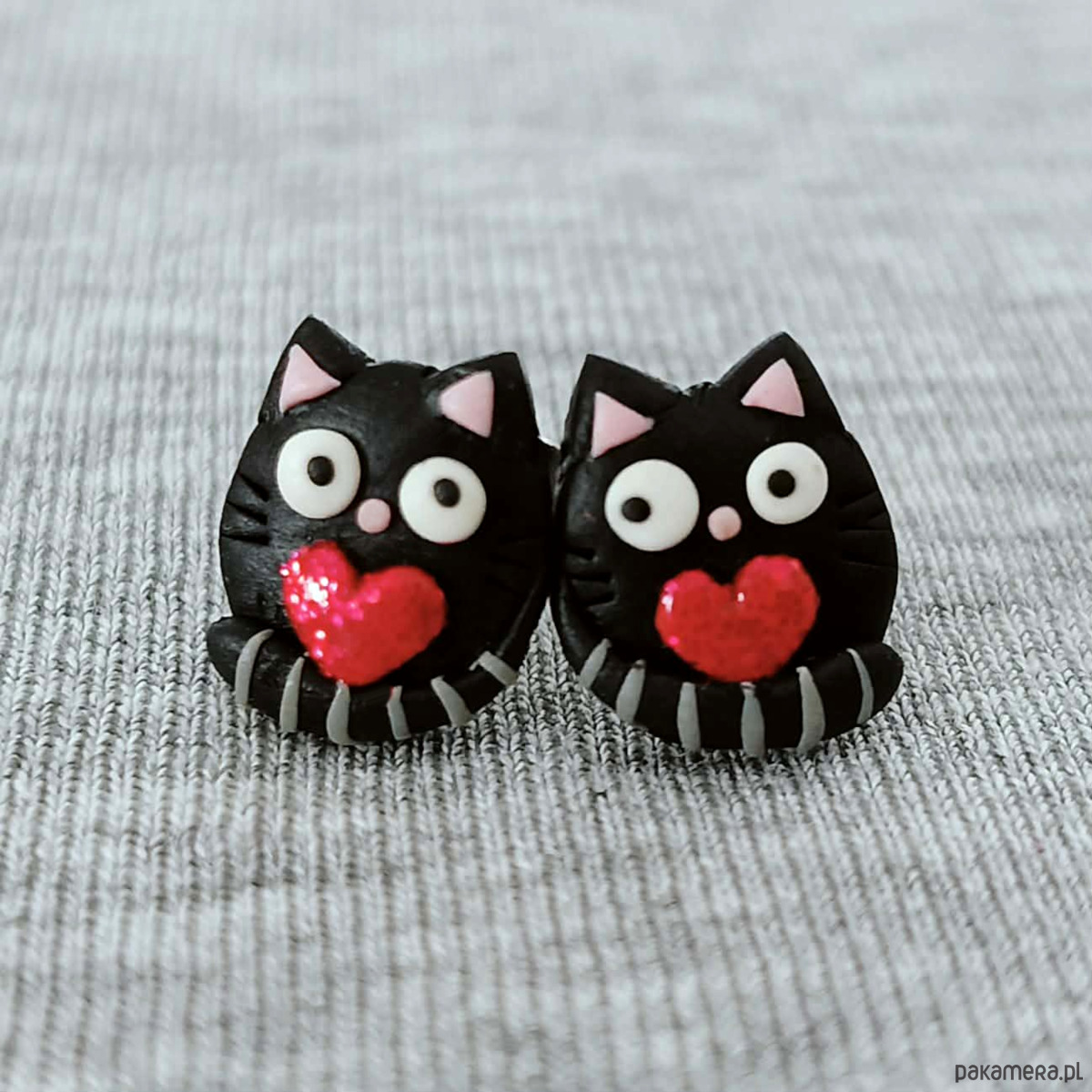 Urocze kolczyki sztyfty w kształcie czarnych kotków trzymających czerwone, delikatnie połyskujące serduszka. Ręcznie wykonane z masy polimerowej, zachwycają wyrazem i starannym dopracowaniem detali.