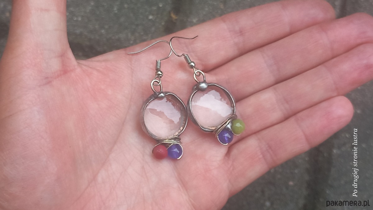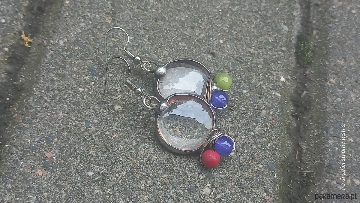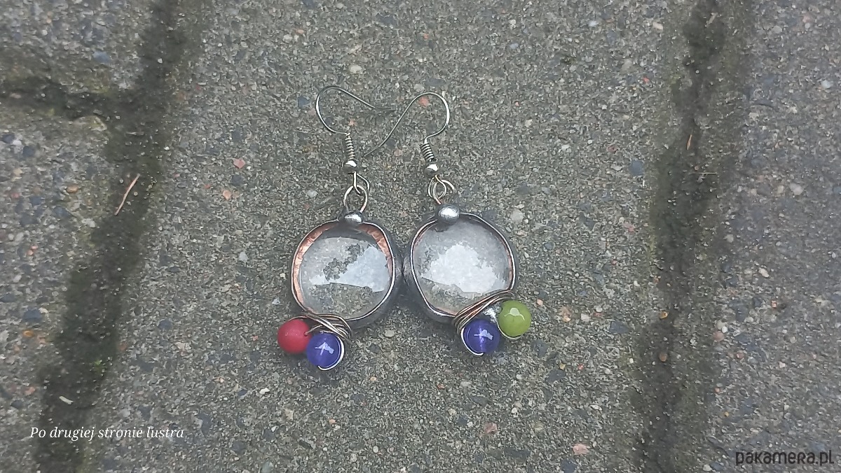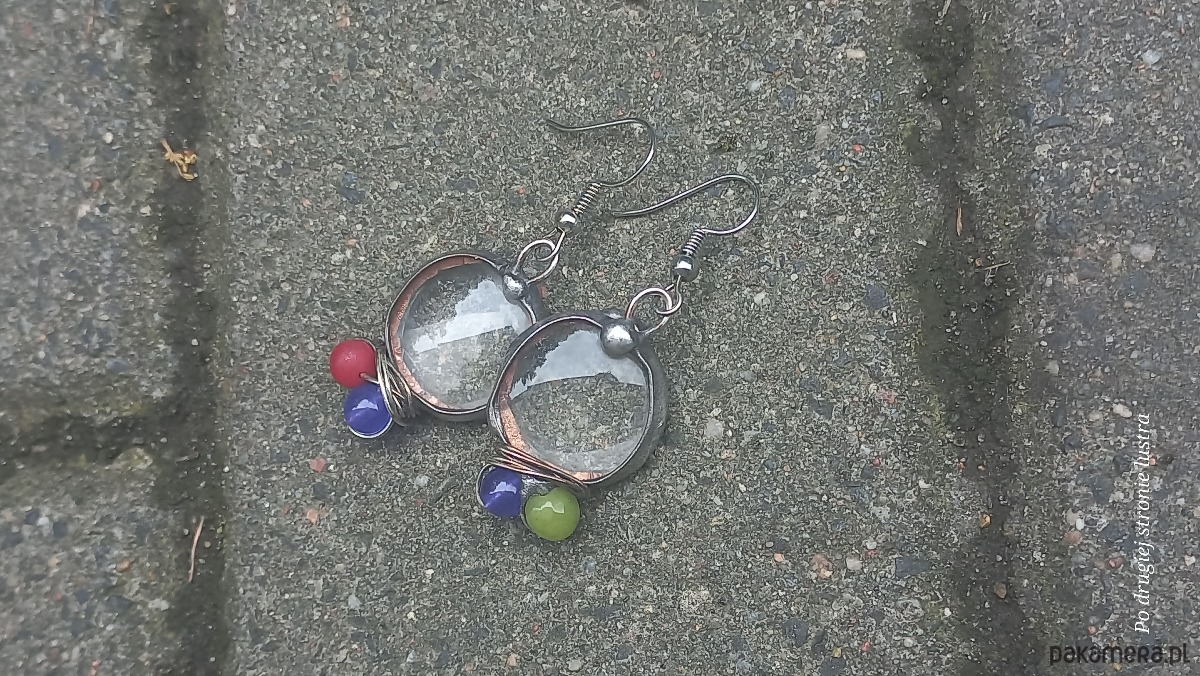 Kolczyki wykonane z miedzi, cyny, szkła, jadeitów i koralowców. Długość z biglem ok. 5 cm, szerokość ok. 2 cm. Bigle metalowe. Kolczyki nie są idealnie równe.
