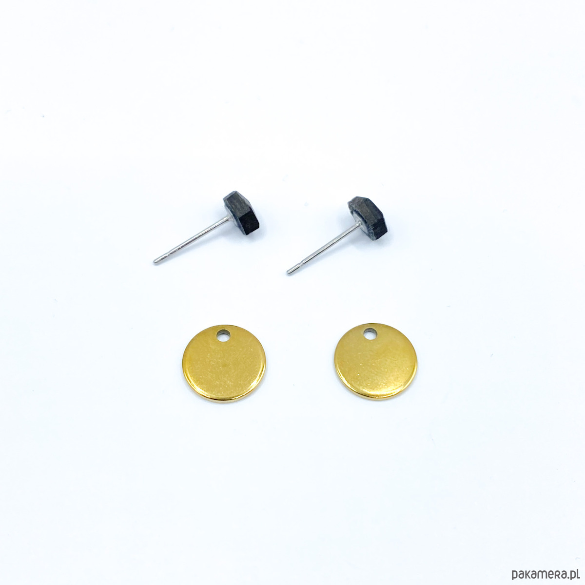 Dodatkiem do kolczyków jest stalowa blaszka, w odcieniu złota, która tak, jak w przypadku kolorowych niedoparków, może zostać zdjęta/zdemontowana ze sztyftu kolczyka.