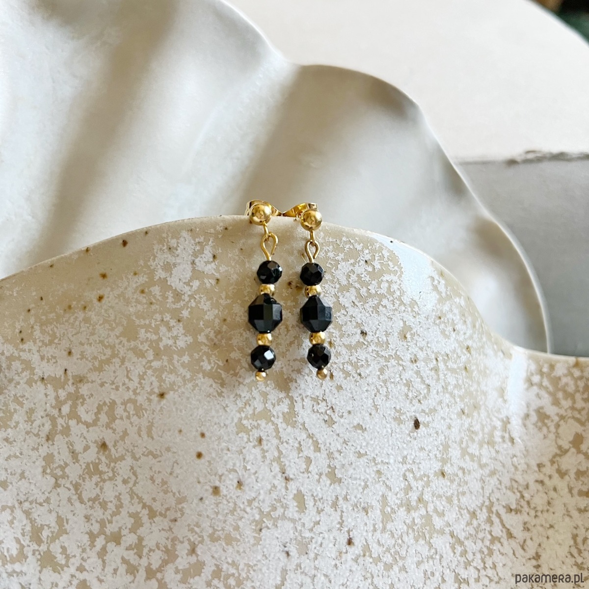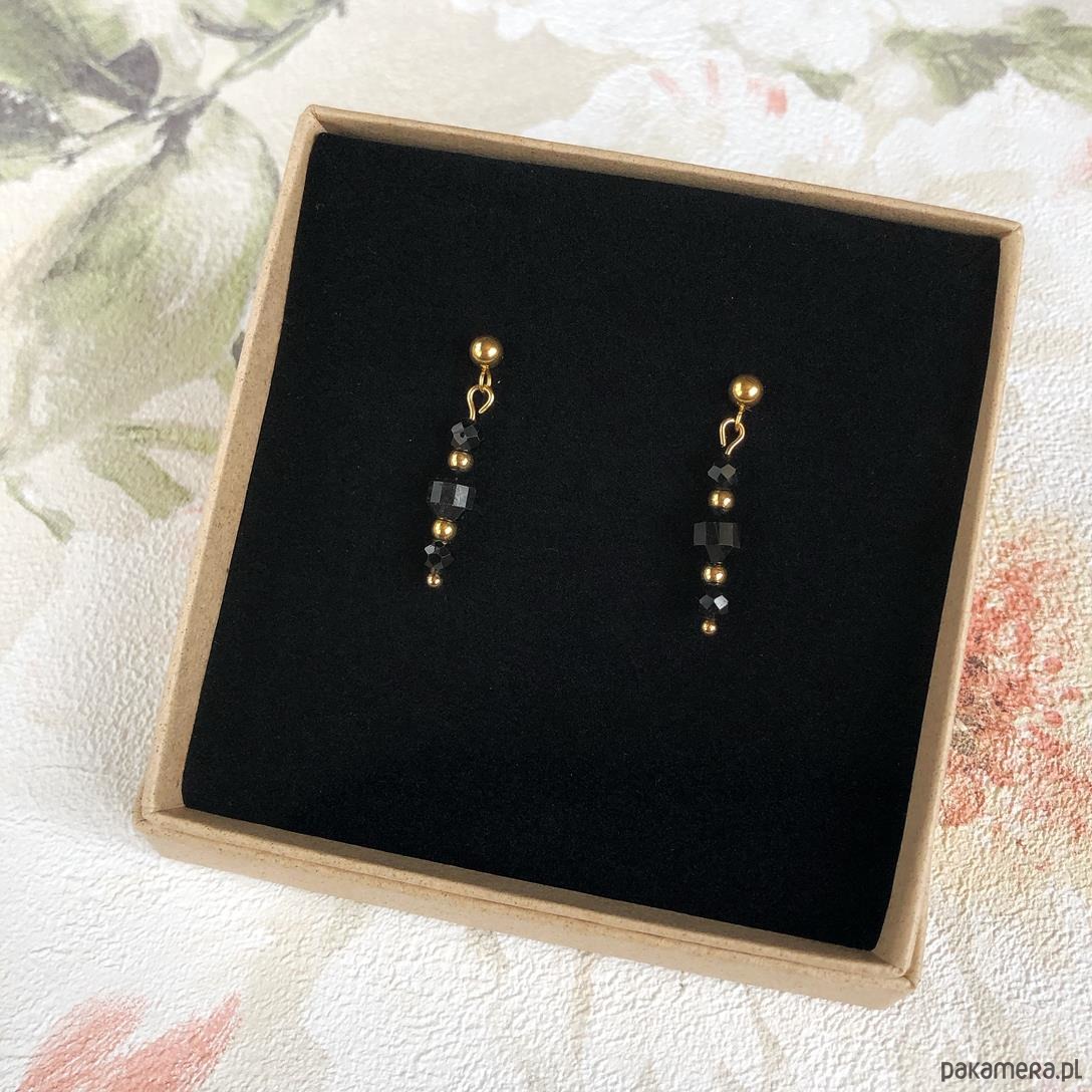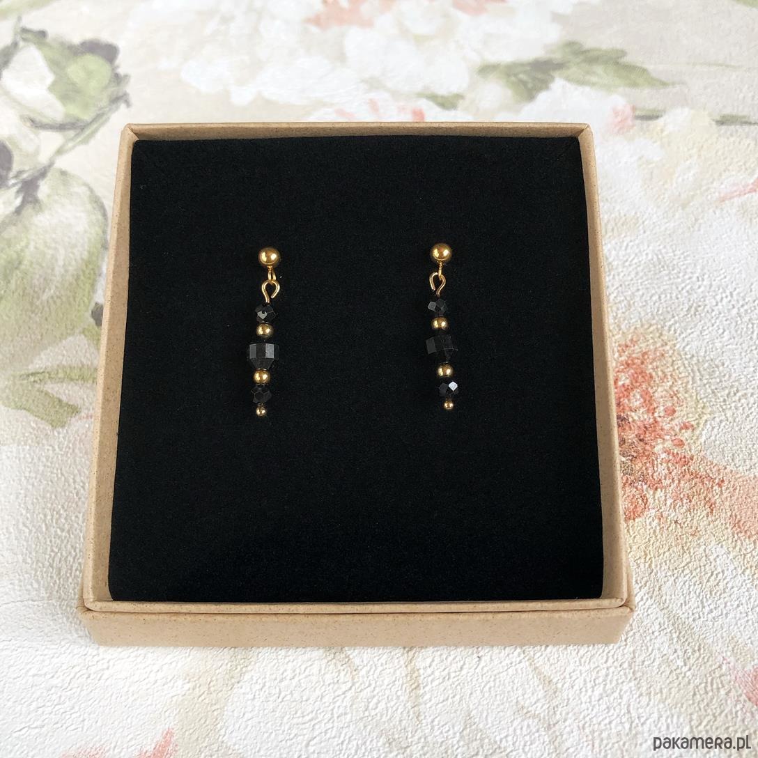Klasyczne eleganckie kolczyki z czarnymi turmalinami na biglu z antyalergicznej stali chirurgicznej w kolorze złotym.