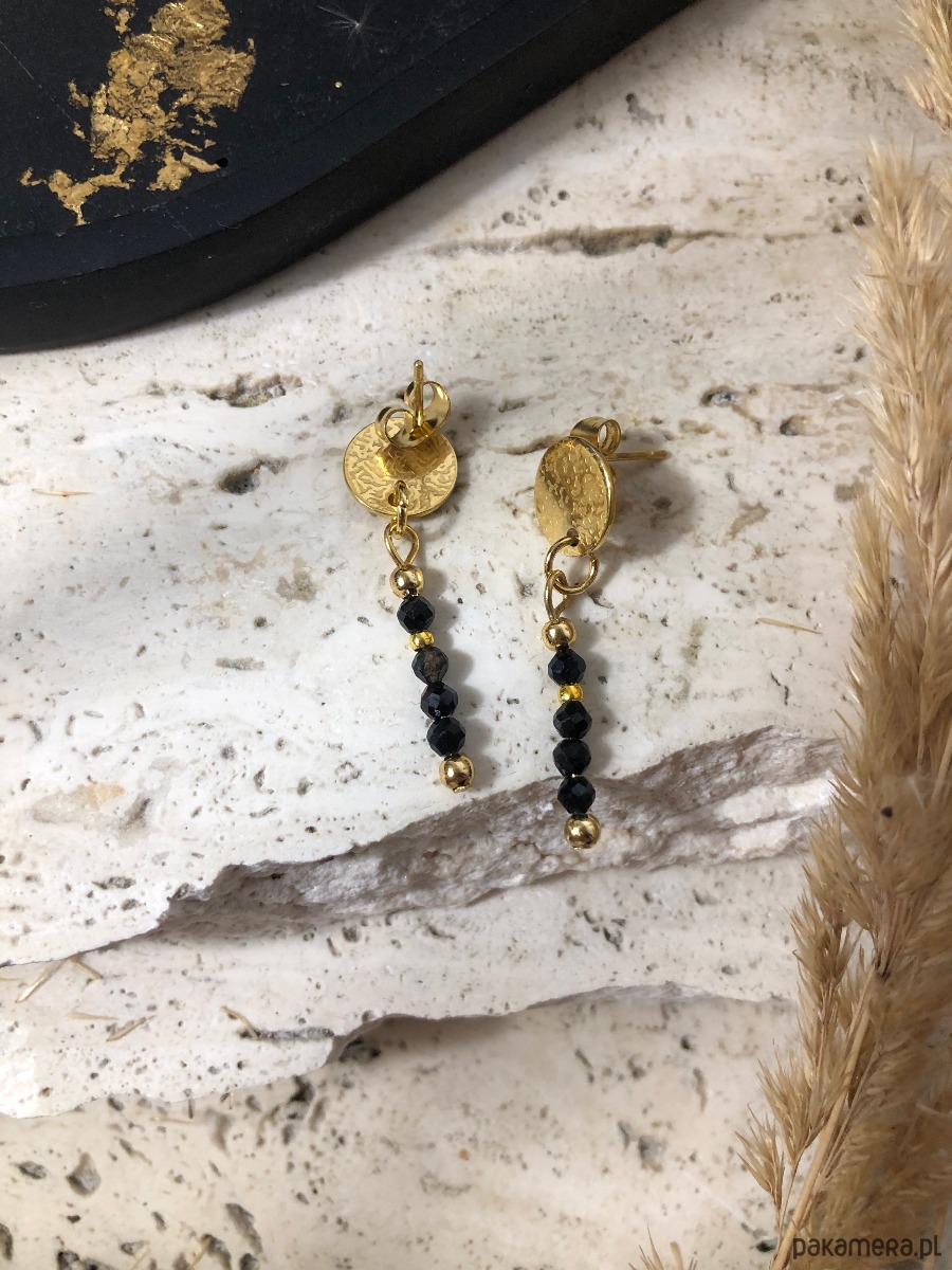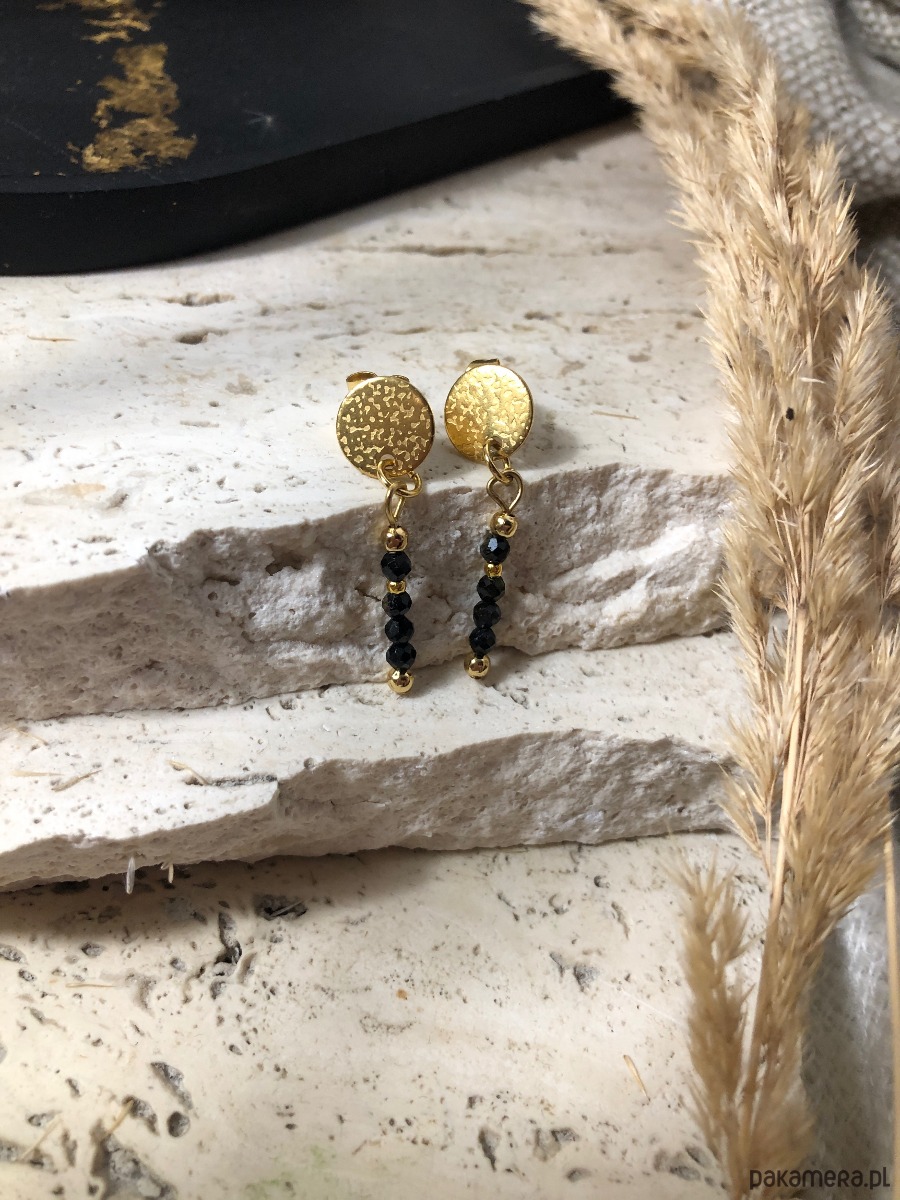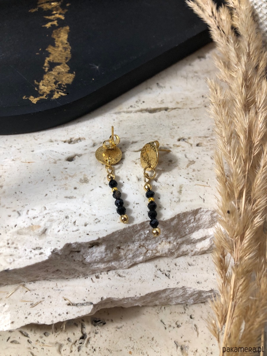 Kolczyki wykonane z kamieni naturalnych i stali chirurgicznej. Na szpilkę jubilerską czarny turmalin o średnicy 3 mm oraz kuleczki w kolorze złotym. Baza kolczyka to kółko nakrapiane ze stali chirurgicznej w kolorze złotym 10mm. Długość całkowita kolczyków to około 3,5 cm.