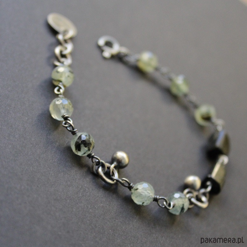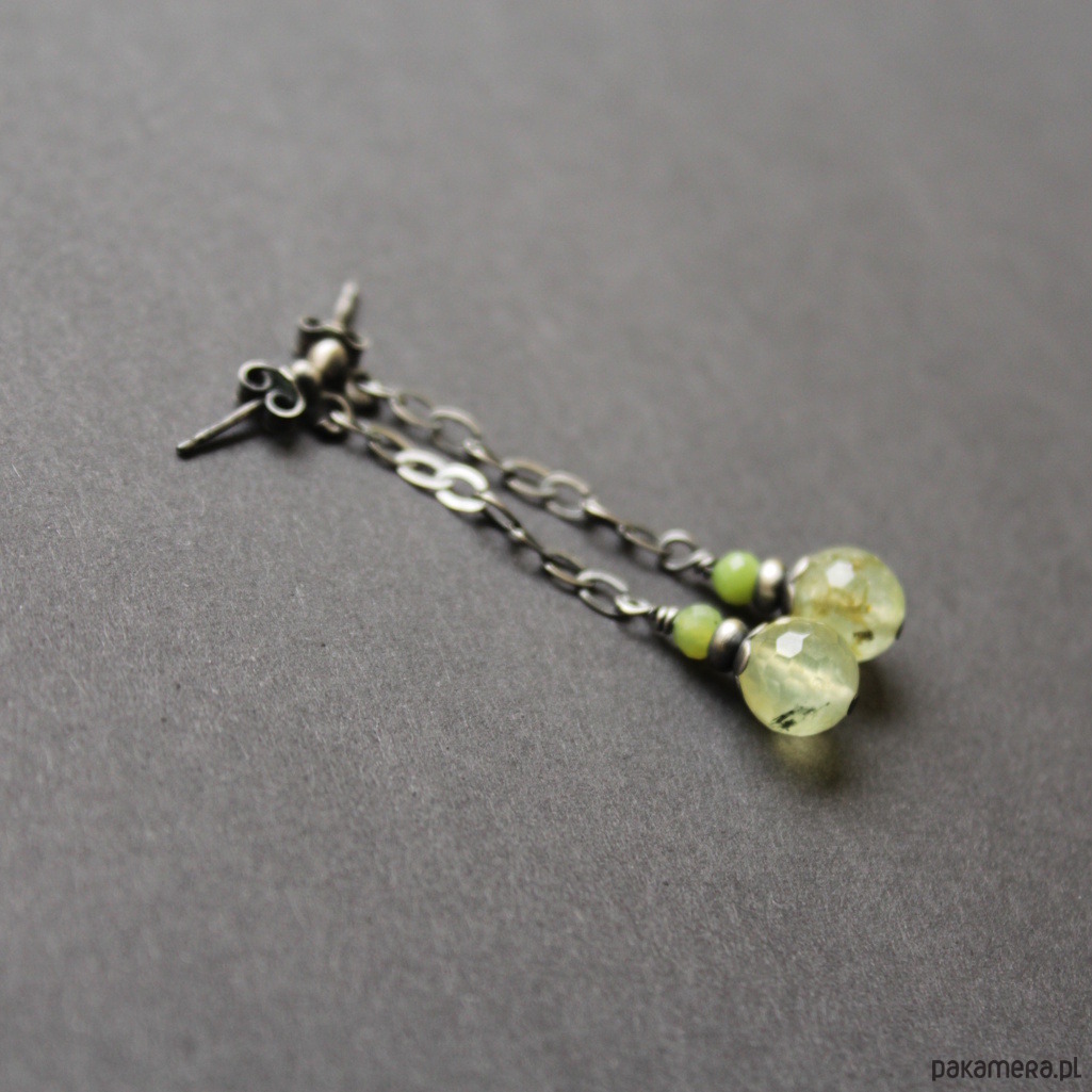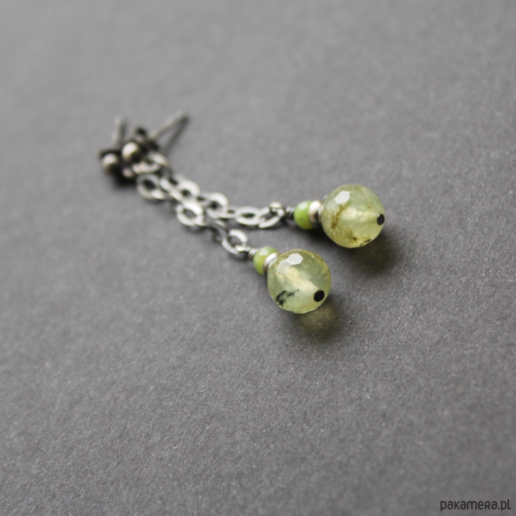 Kamienie: przepiękne fasetowane prehnity wielkości 0,5 cm oraz fasetowane chryzopracy wielkośći 0,3 cm.