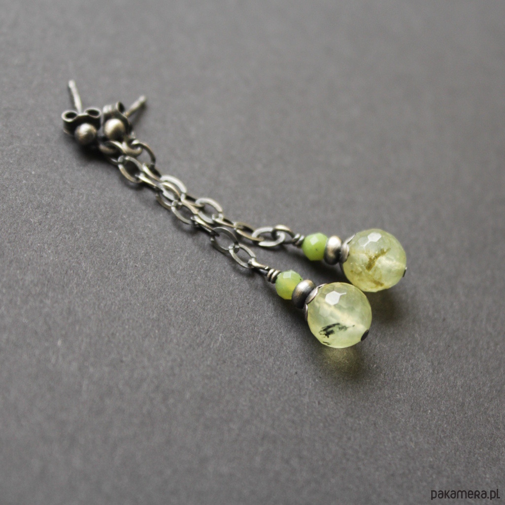 Kamienie: przepiękne fasetowane prehnity wielkości 0,5 cm oraz fasetowane chryzopracy wielkośći 0,3 cm.