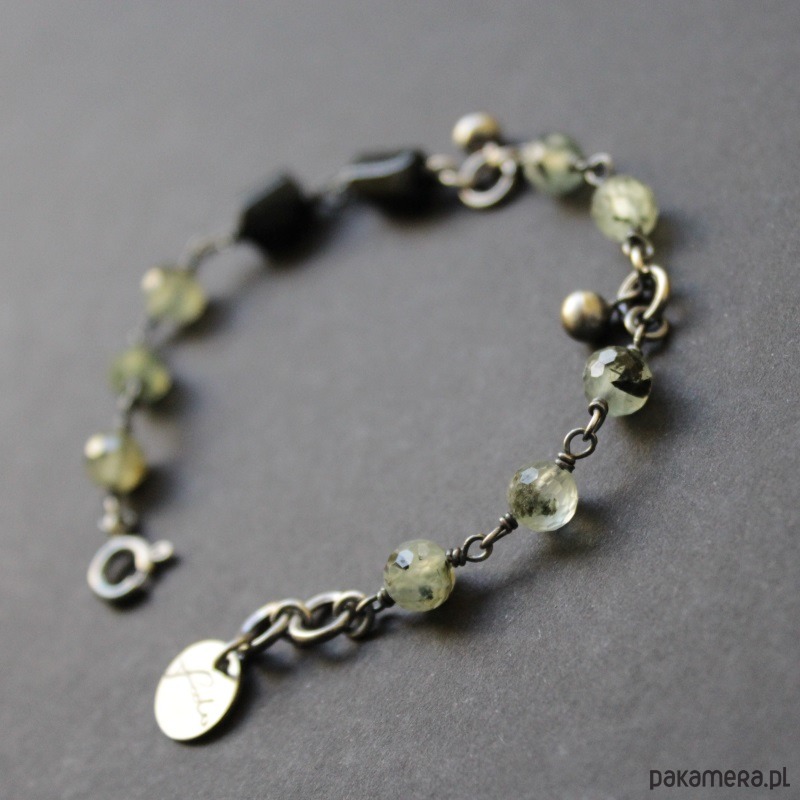 Oksydowane srebro pięknie podkreśla delikatną, seledynową barwę kamienia.