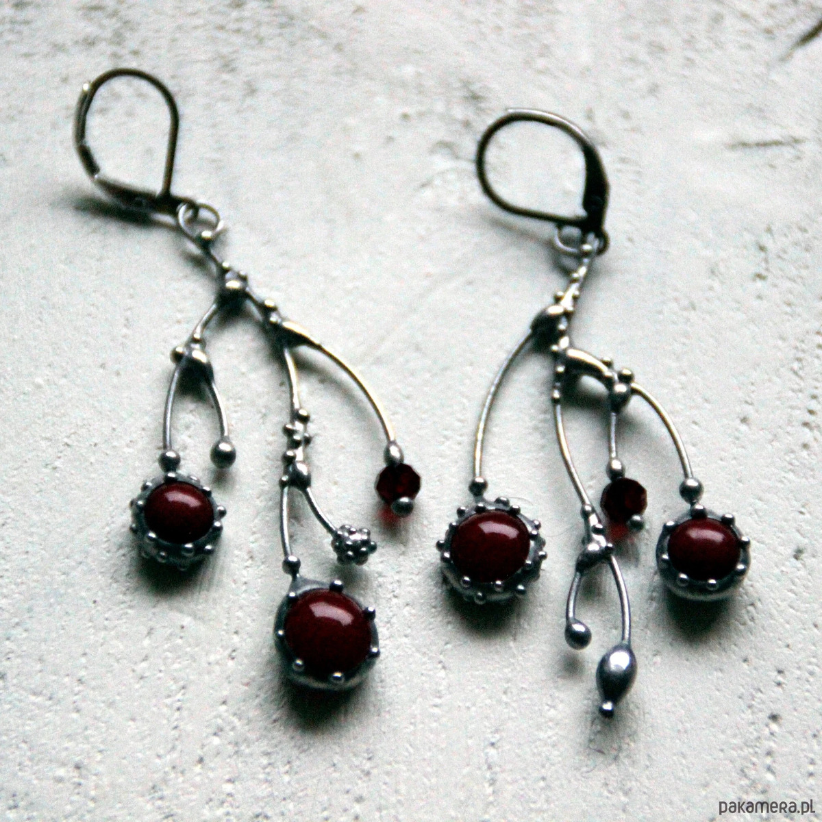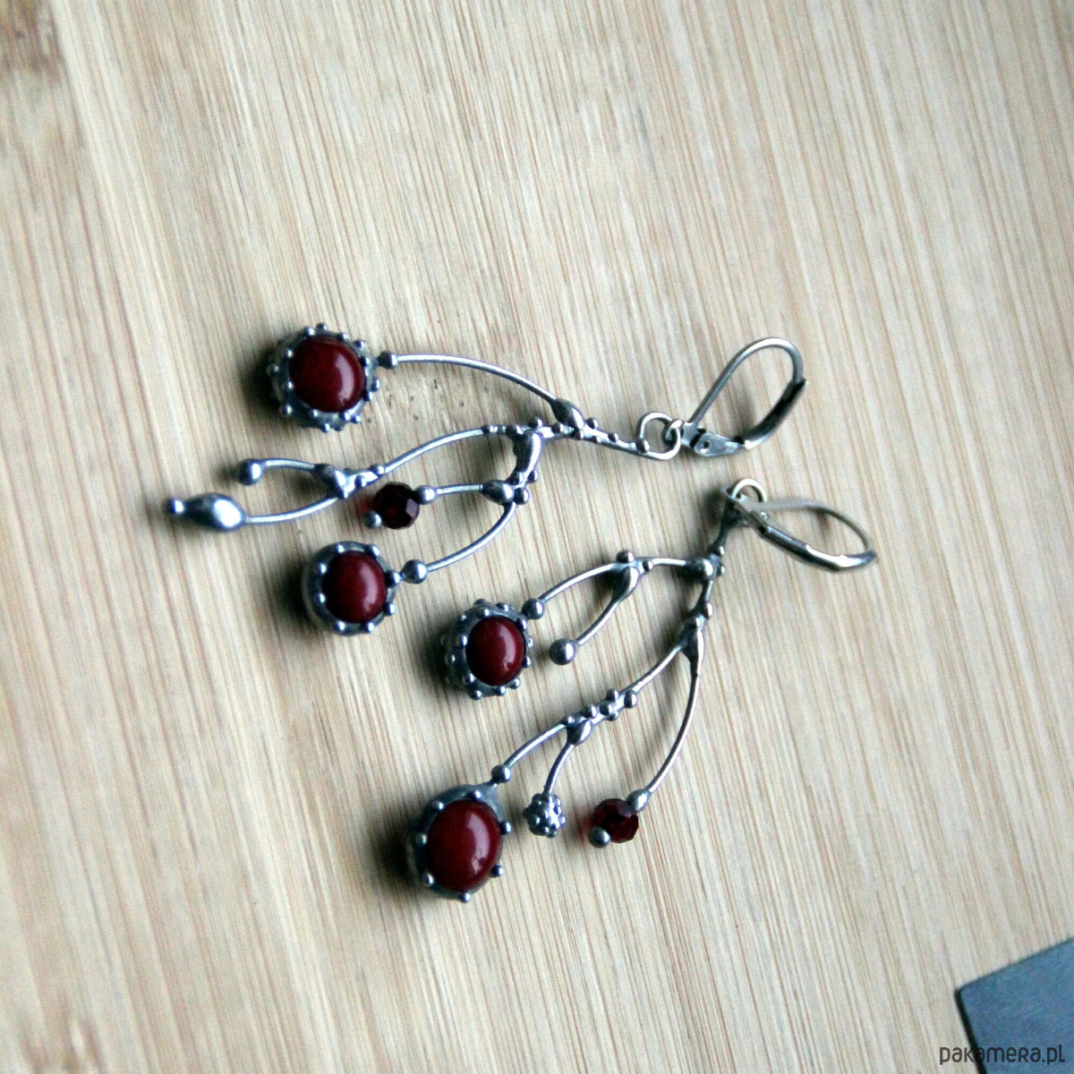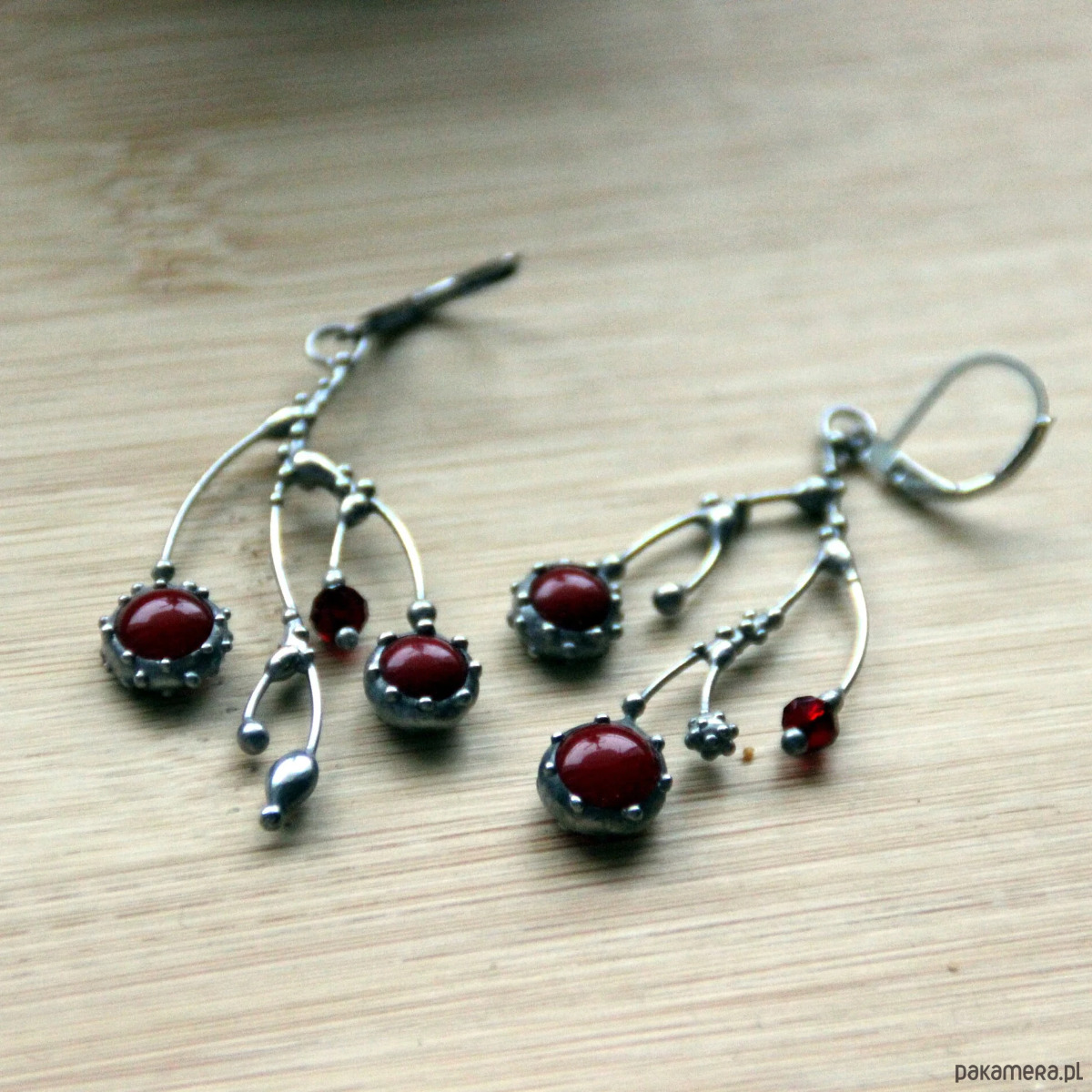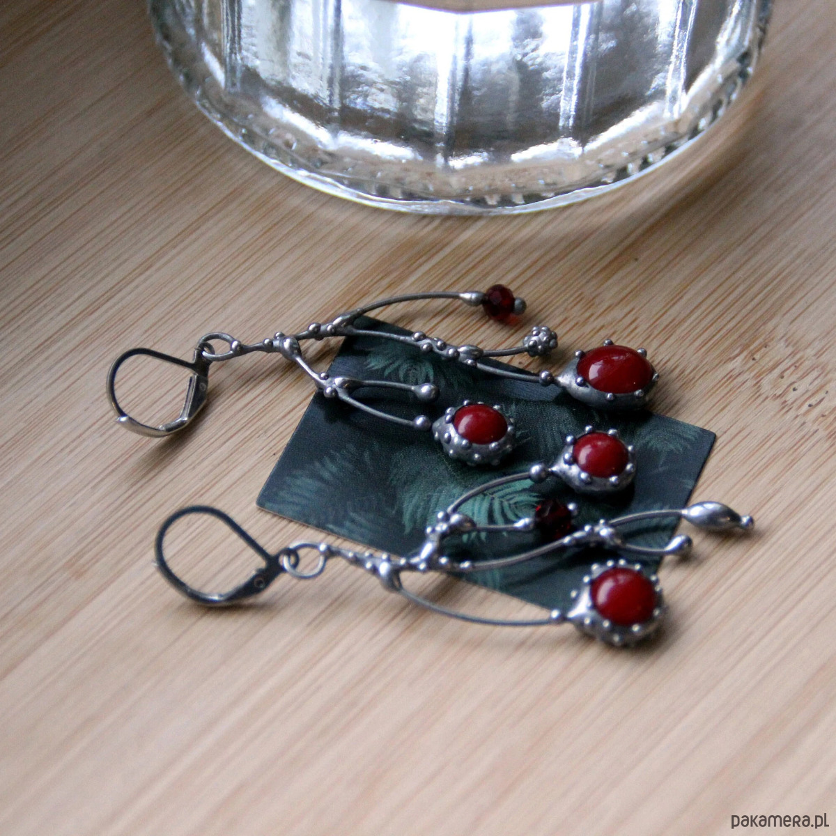 Kolczyki czarownicy z gałązkami i czerwonym szkłem asymetryczna biżuteria