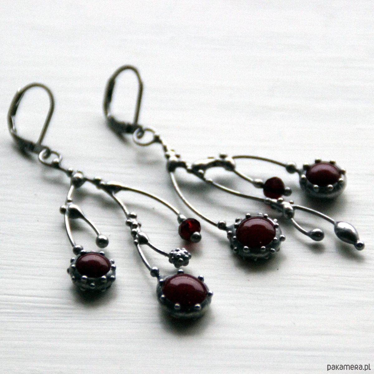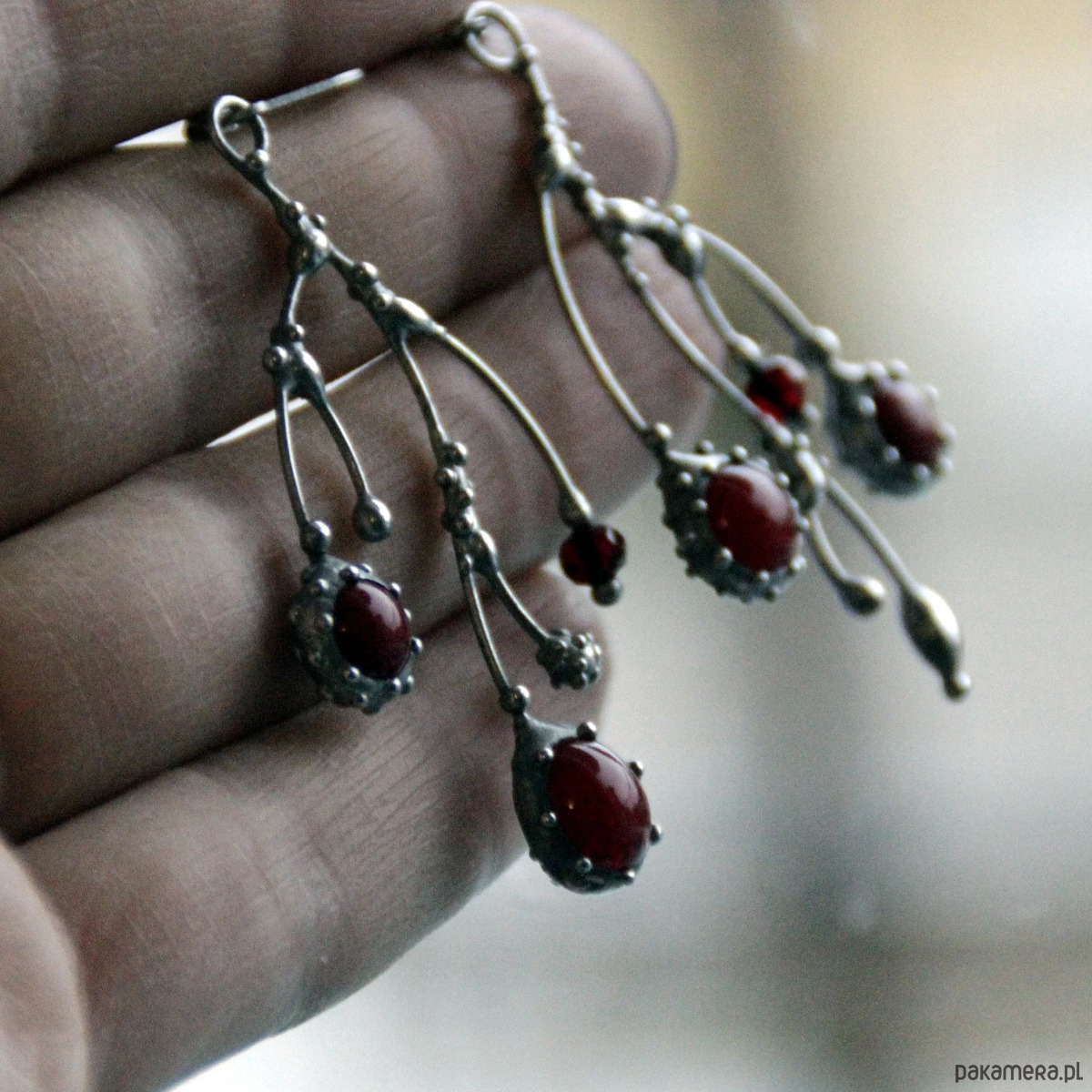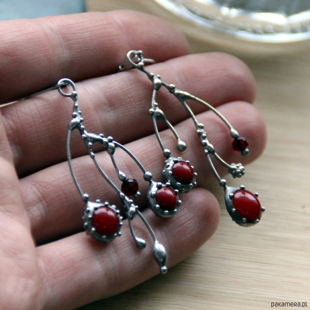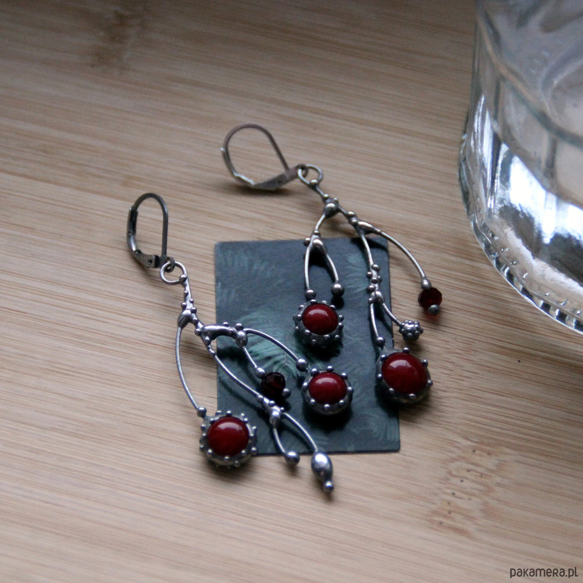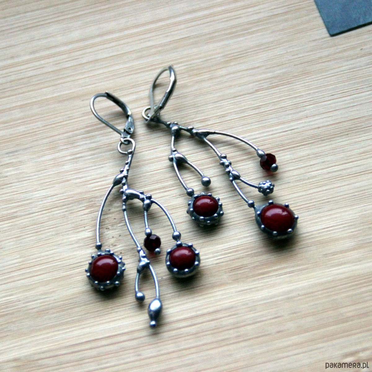 Kolczyki czarownicy z gałązkami i czerwonym szkłem asymetryczna biżuteria