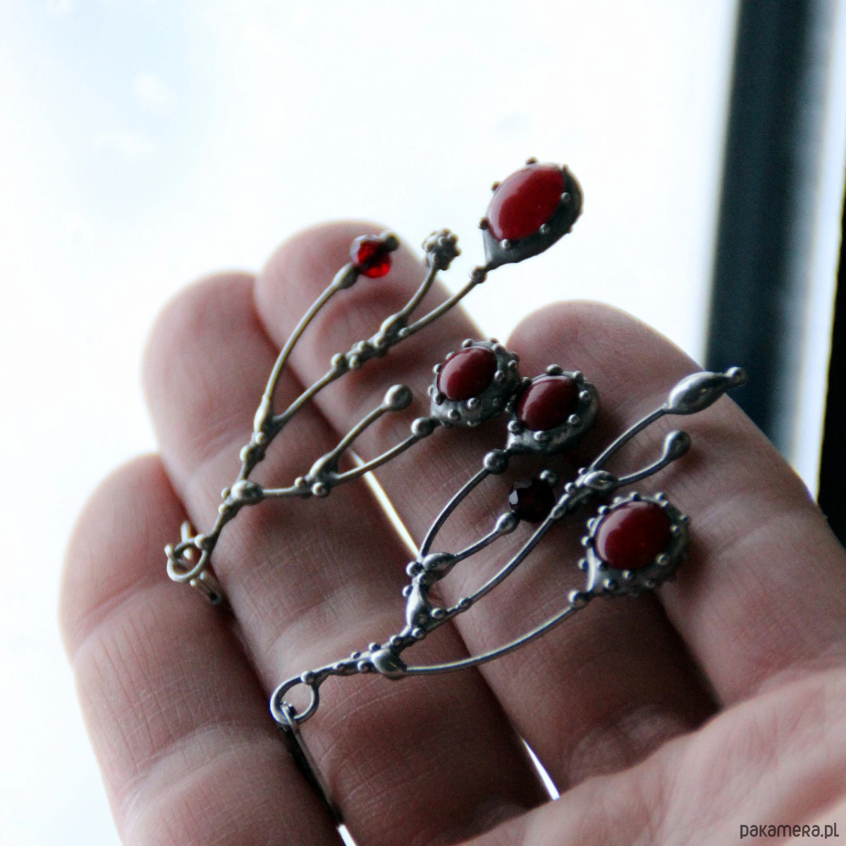 Te asymetryczne kolczyki z gałązkami leśnymi „kolczyki z gałązkami drzew” wykonane są z miedzi, stopu cyny, stali i czerwonego szkła. Są lekkie, cienkie i asymetryczne. Wszystkie elementy są wykonane ręcznie, co zapewnia indywidualność każdego produktu wytworzonego w warsztacie Yadovito. Stop cyny i miedzi pokryty jest czarną patyną, aby nadać metalowi czarny kolor, a następnie polerowany roztworem wykończeniowym, aby nadać biżuterii szlachetny wygląd, a jednocześnie zapobiec utlenianiu się metalu. W kolczykach wykorzystano szkło stopione w specjalnym piecu. Po stopieniu szkło nabiera niemal unikalnego kształtu i niesamowitych odcieni kolorów, które mienią się w świetle. Rozmiar około 6/3 cm. Kolor srebrny/czerwony.