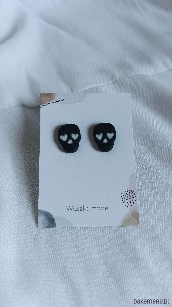 Kolczyki wykonane z glinki polimerowej w kształcie głowy czaszki. Elementy metalowe to stal chirurgiczna.
