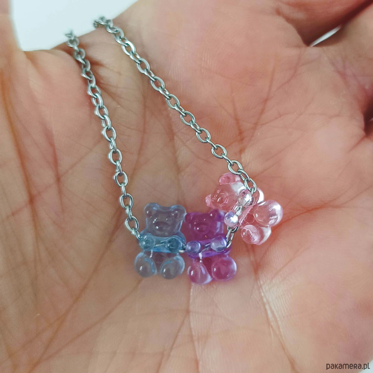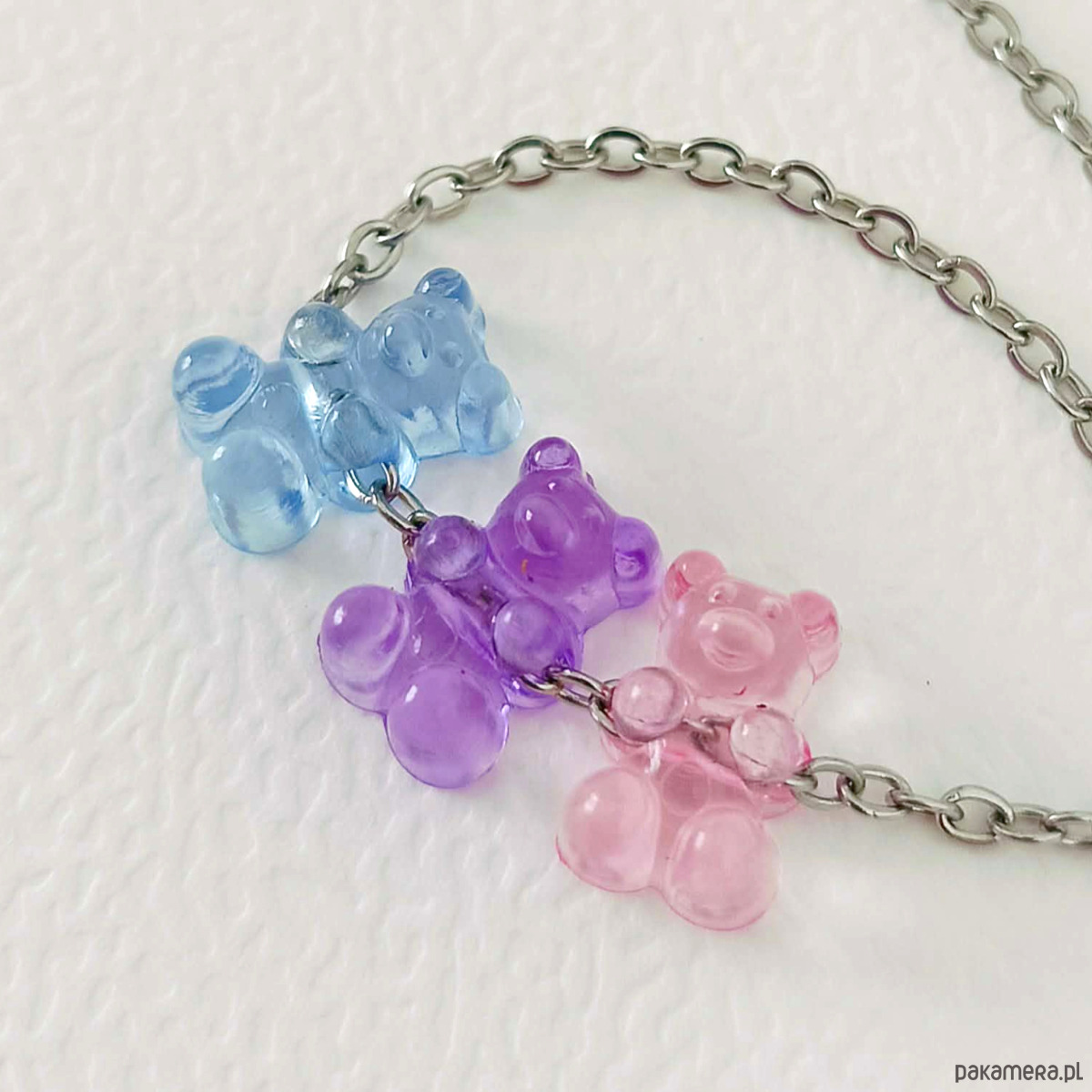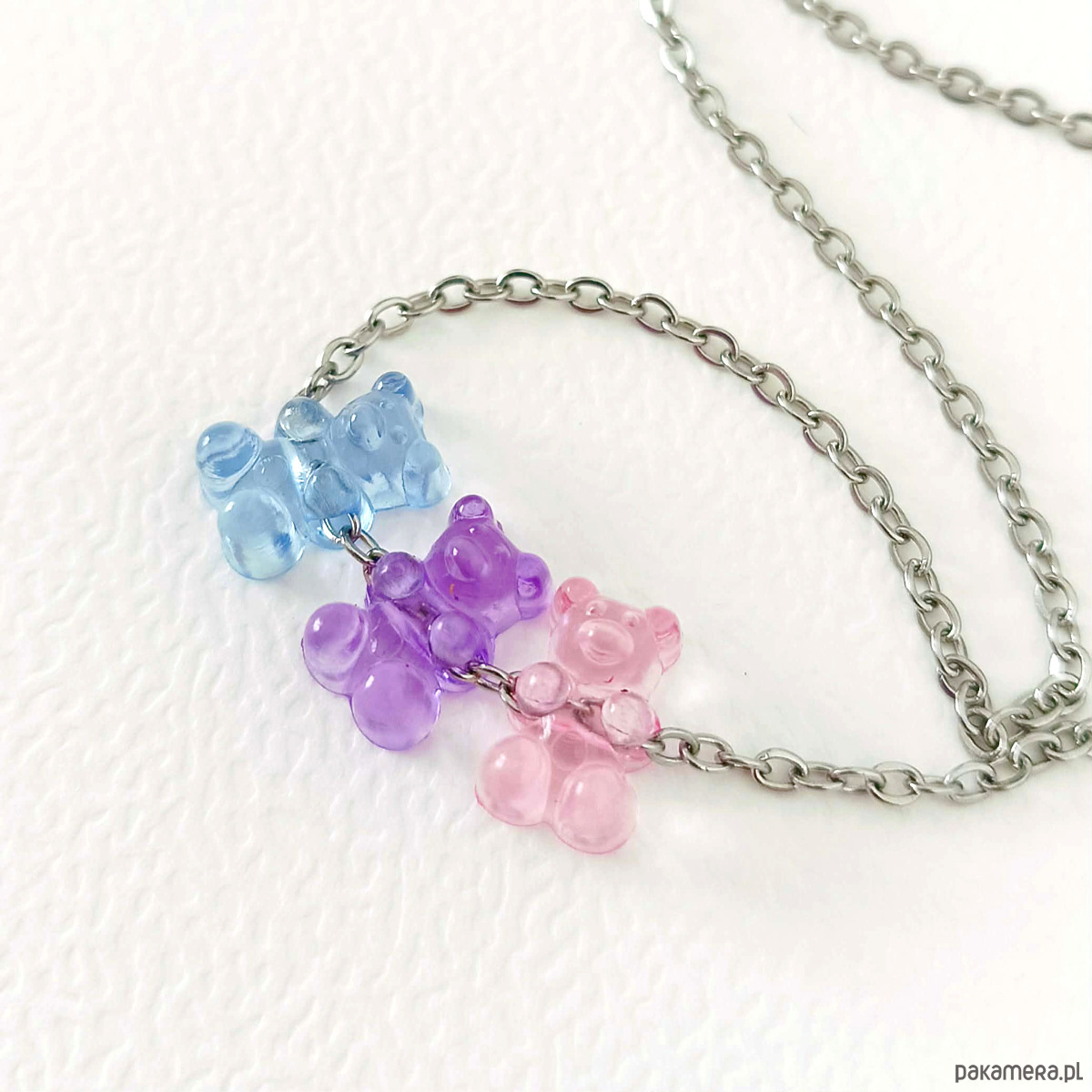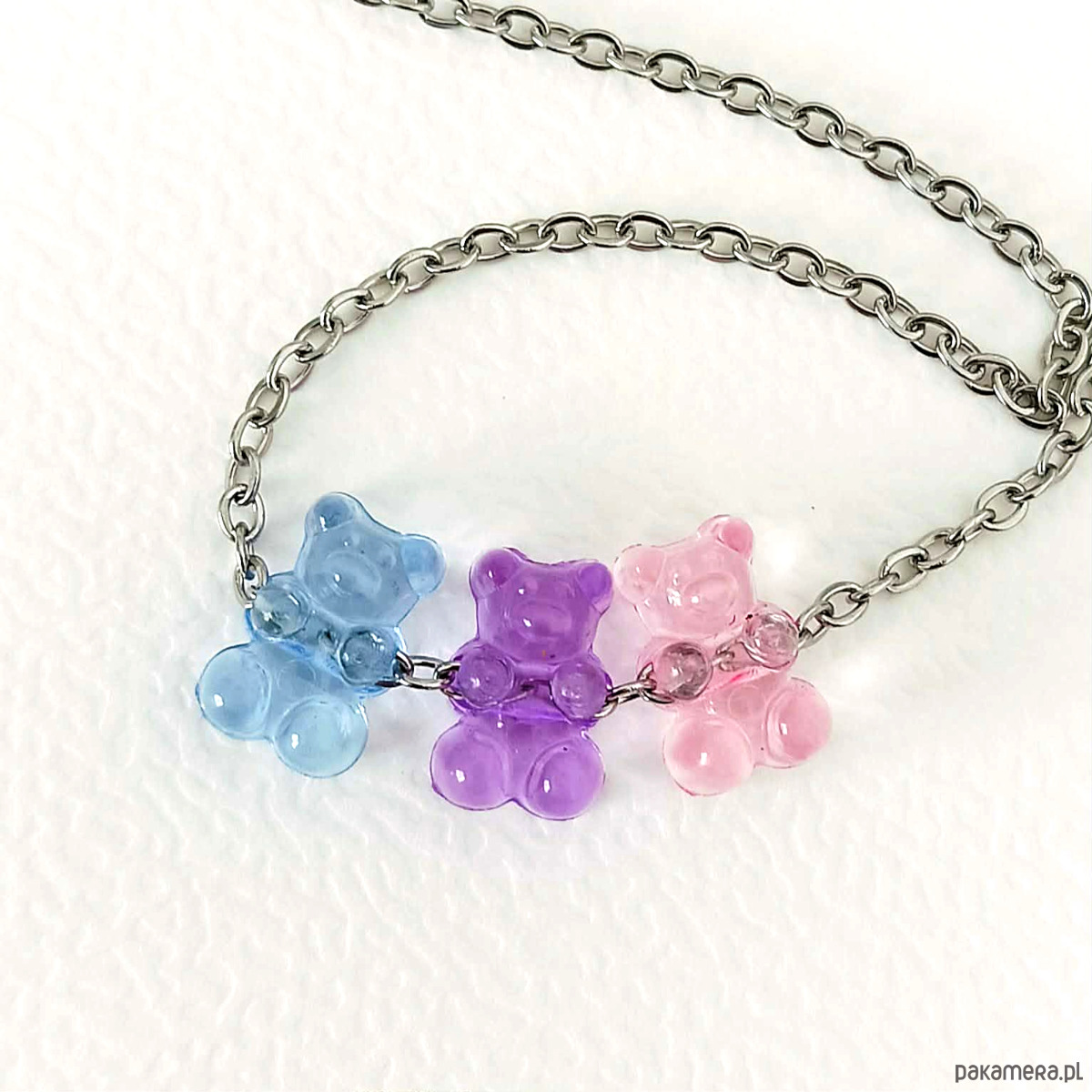 Uroczy i zabawny naszyjnik wykonany z akrylowych koralików w kształcie misiów w stylu żelkowym.