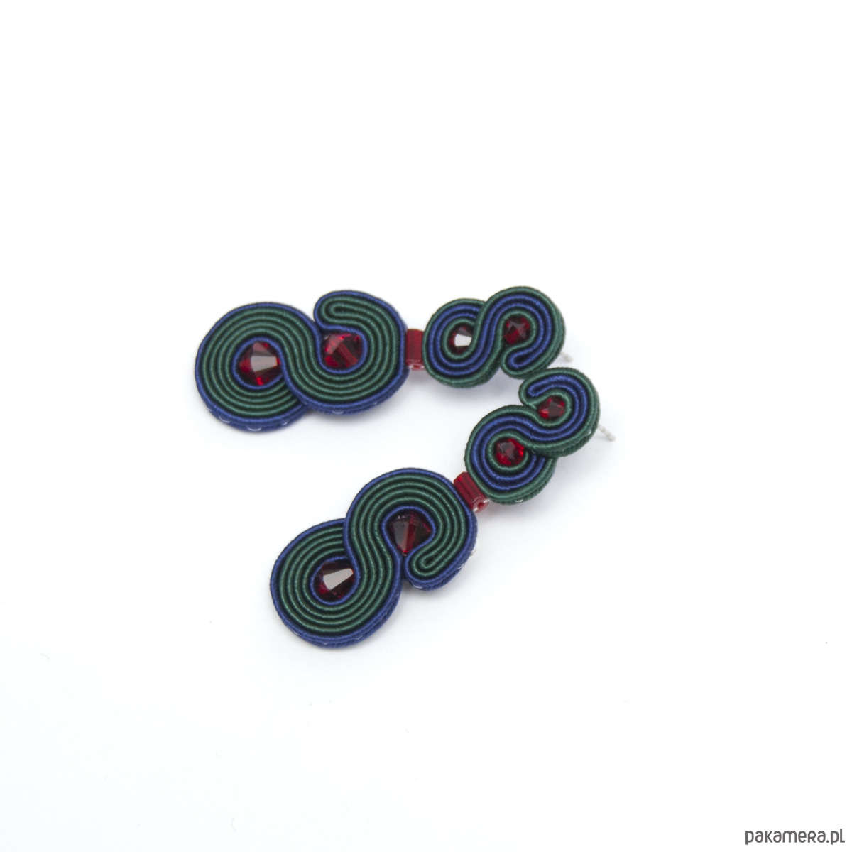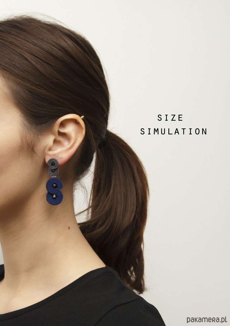Kolczyki wykonane są techniką haftu soutache. Zrobione z kryształków Swarovskiego, sznurków sutasz i sztyftów ze stali chirurgicznej (antyalergiczna). Tył kolczyków stanowi cienka, delikatna skóra naturalna. Długość kolczyka to około 5 cm, szerokość w najszerszym miejscu wynosi około 2 cm. Kolczyki zabezpieczone są impregnatem.