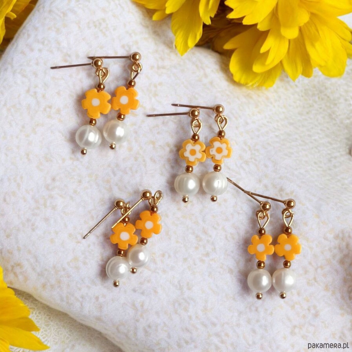 Kolczyki wykonane z naturalnych, lekko nieregularnych perełek słodkowodnych (ok. 7mm), szklanych kwiatuszków (żółto-białe) i przekładek ze złotego hematytu.