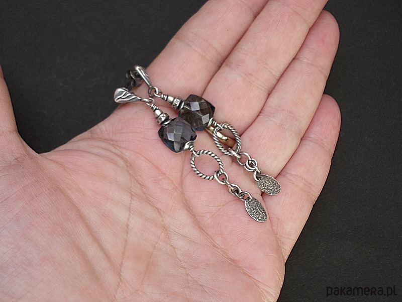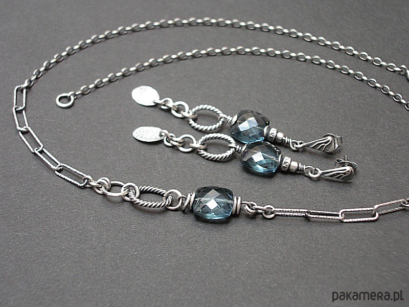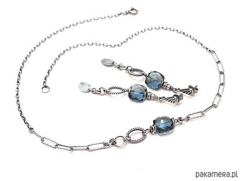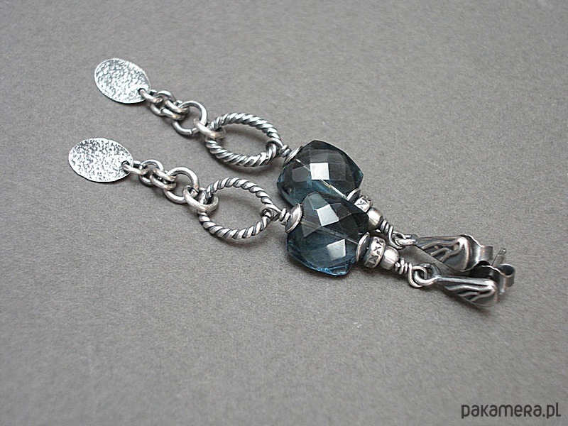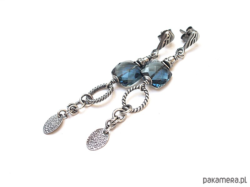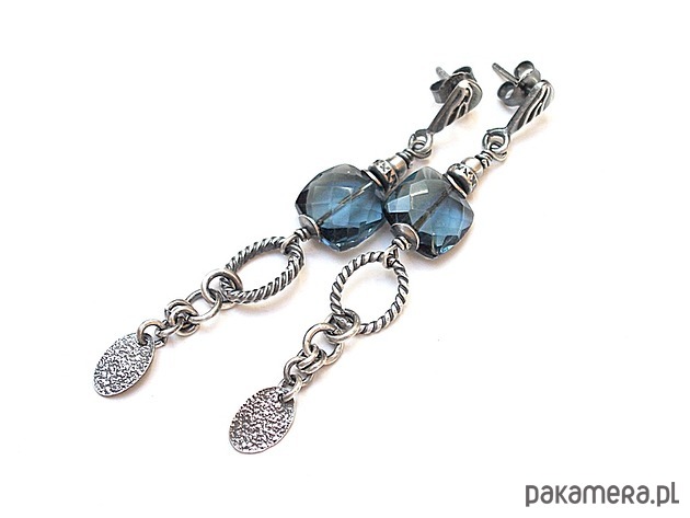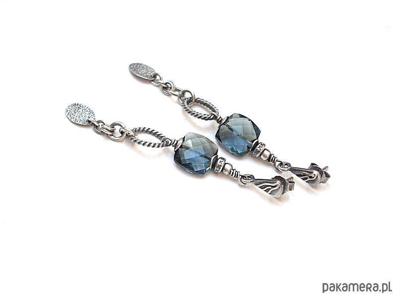 Kolczyki wykonane ze srebra [pr. 925 i 930] w połączeniu z wysokiej jakości fasetowanymi poduszeczkami kwarcu blue london [10mm]. Całość oksydowana i przetarta. Całkowita długość kolczyków 6,4cm. Biżuteria ozdobnie zapakowana. Do kompletu można dokupić naszyjnik dostępny w naszej galerii - przykładowe zdjęcia.