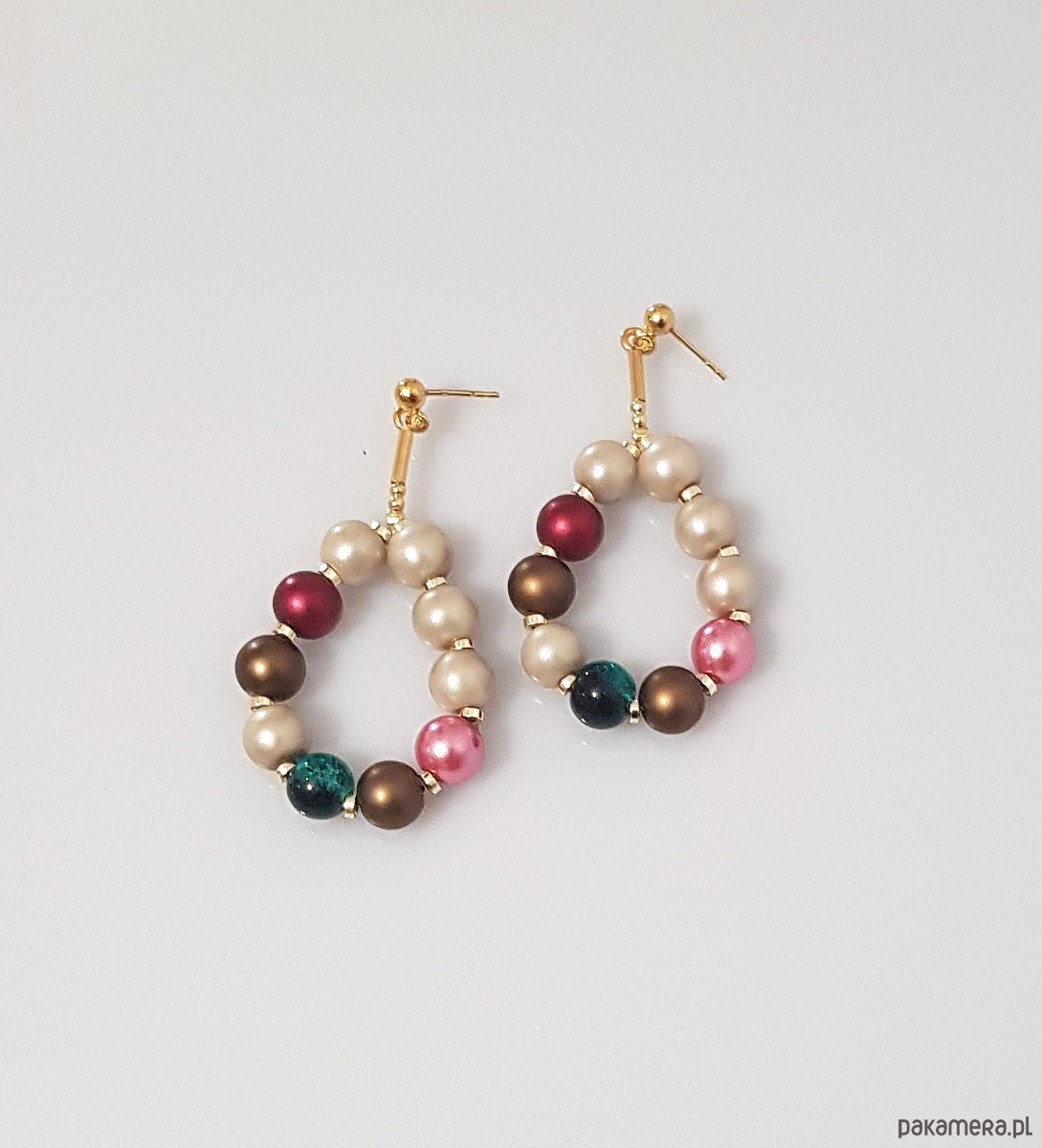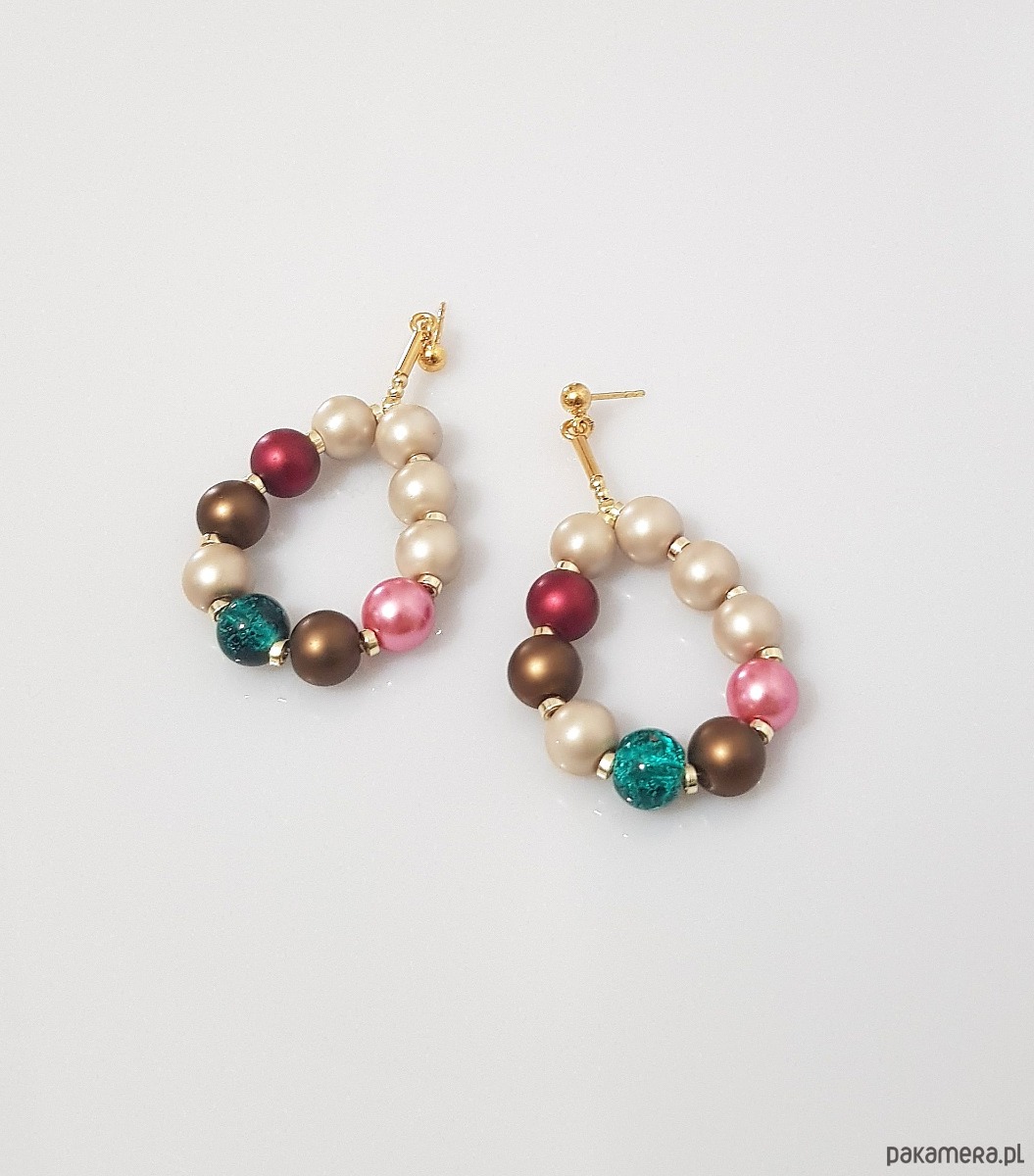 Kolorowe szklane perełki, matowe i błyszczące, przekładki ze złotego hematytu.