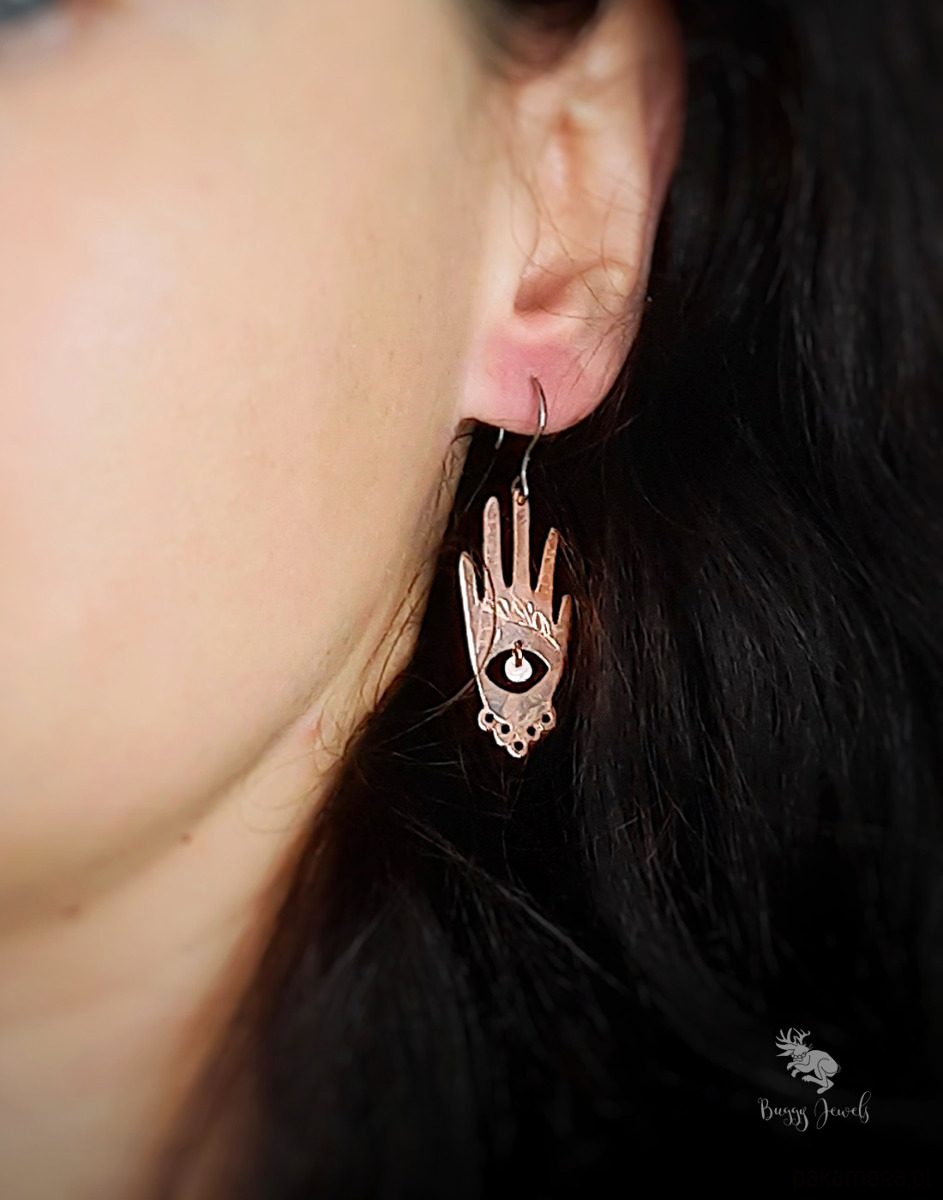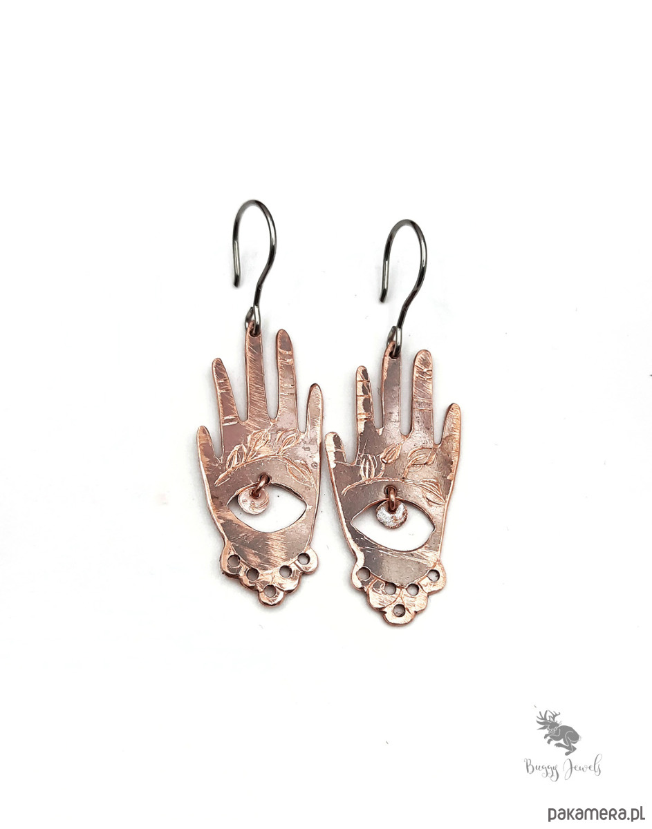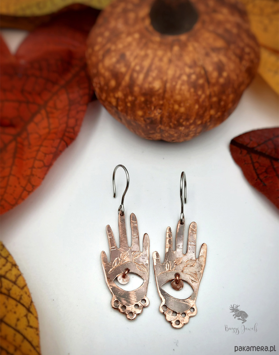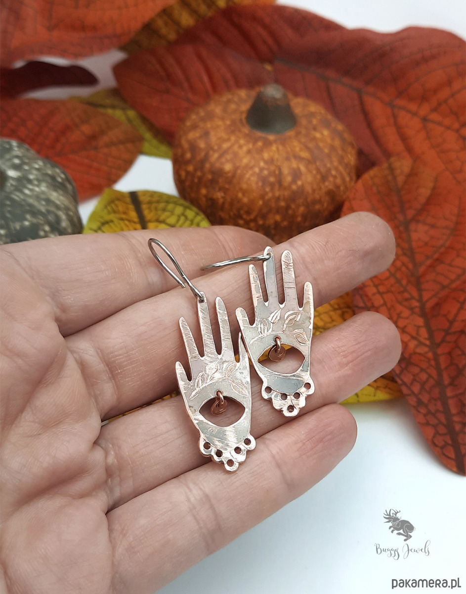 Kolczyki wykonane z miedzi. Wykonane całkowicie ręcznie z blachy miedzianej. Lekko patynowane i satynowane. Posiadają ruchome kółeczko wewnątrz i delikatny grawer listków.