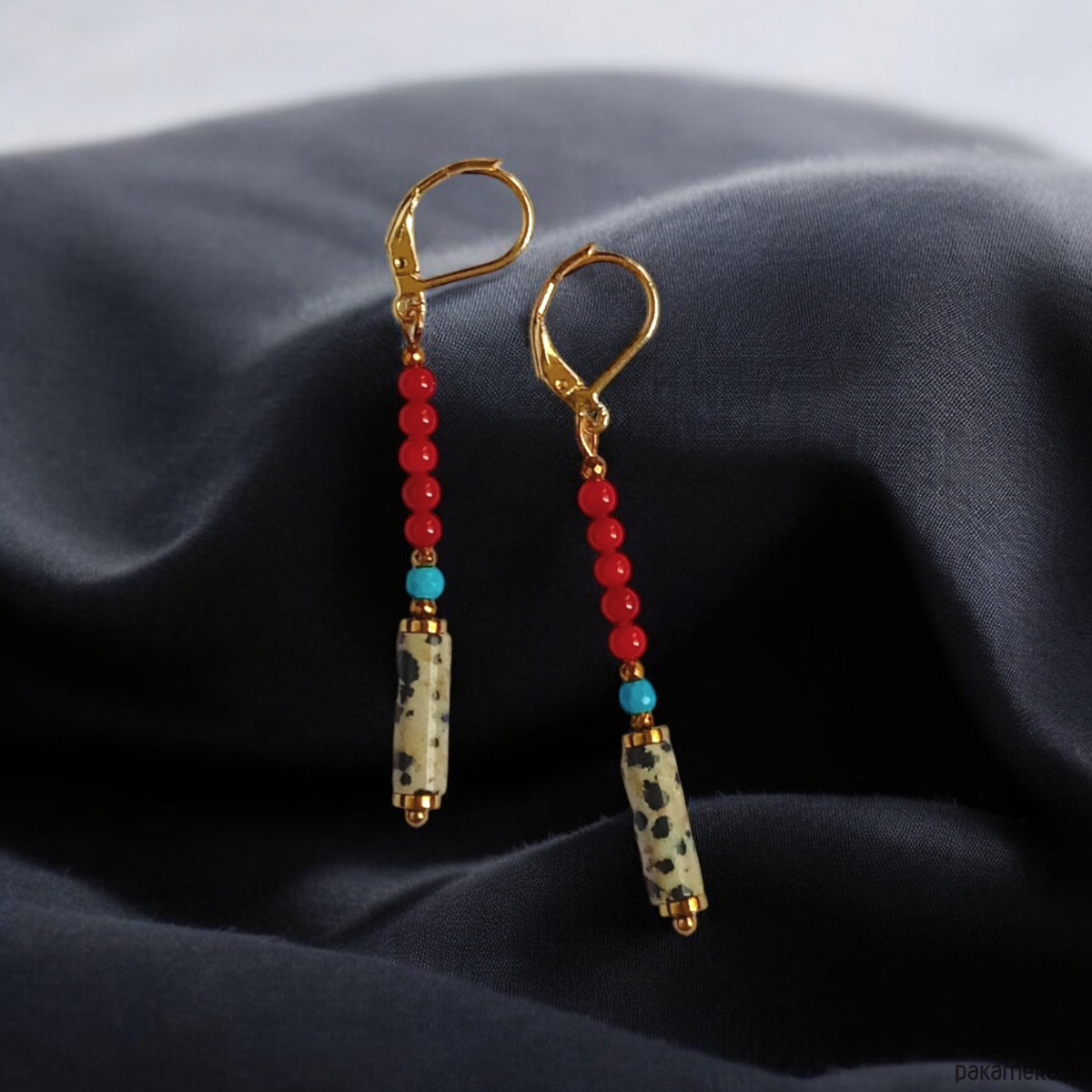 Wykonane z połączenia jaspisu dalmatyńskiego (słupki 14mm) , czerwonego korala 3mm, magnezytu turkusowego 3mm oraz przekładek ze złotego hematytu.