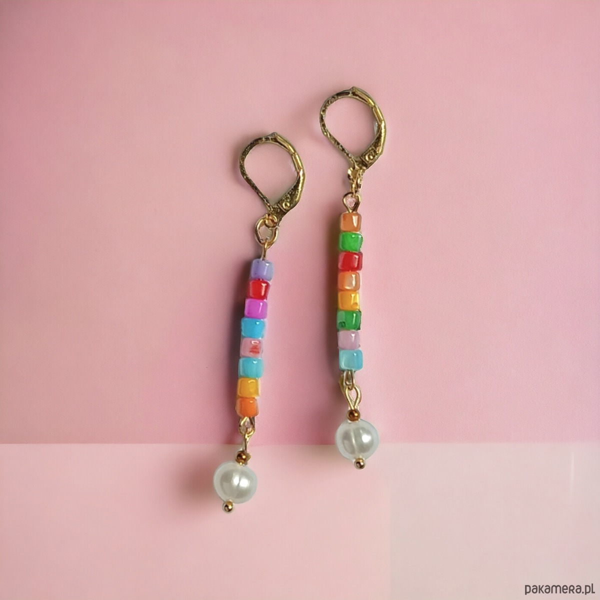 Efektowne, długie i LEKKIE kolczyki - zostały wykonane z kolorowej muszli (wałeczki 3x4mm), przekładek ze złotego hematytu oraz naturalnych pereł słodkowodnych 7-8mm.