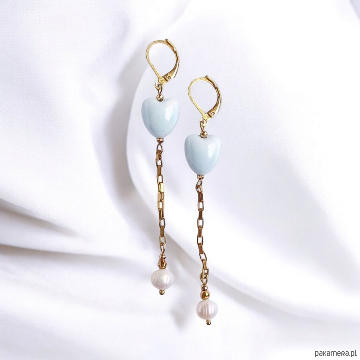 Kolczyki dłuuugie : serduszka ceramiczne i perły : niebieskie