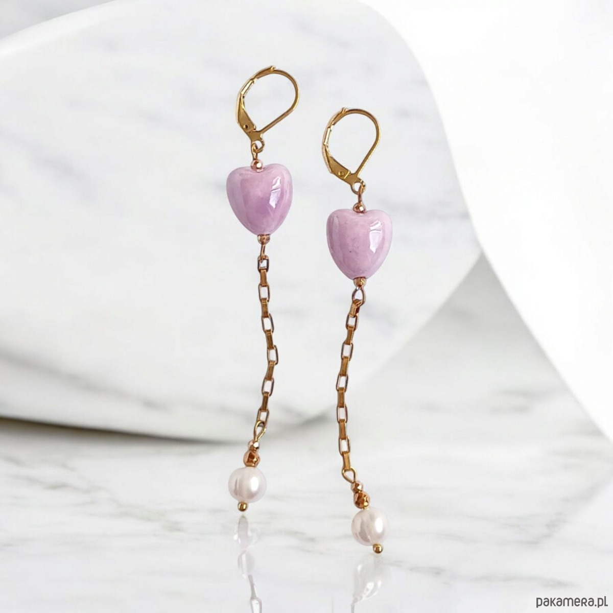 Kolczyki dłuuugie : serduszka ceramiczne i perły : różowe