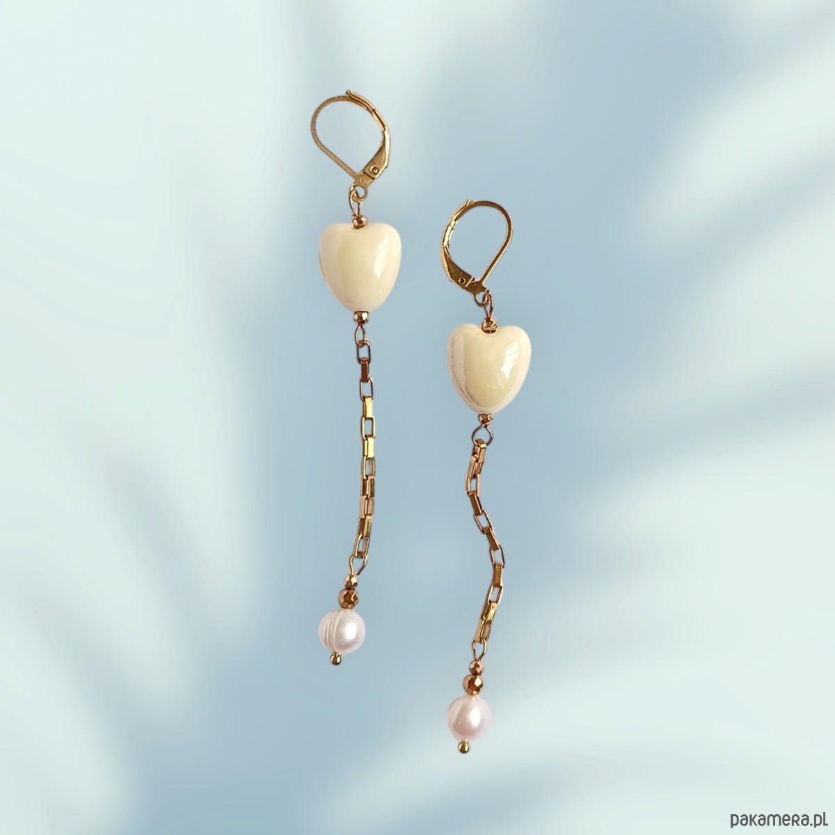 Efektowne, długie i LEKKIE kolczyki - zostały wykonane z ceramicznych serduszek (ok. 13mm) oraz ozdobnych elementów ze stali w kolorze złotym, przekładek że złotego hematytu i białych pereł słodkowodnych.