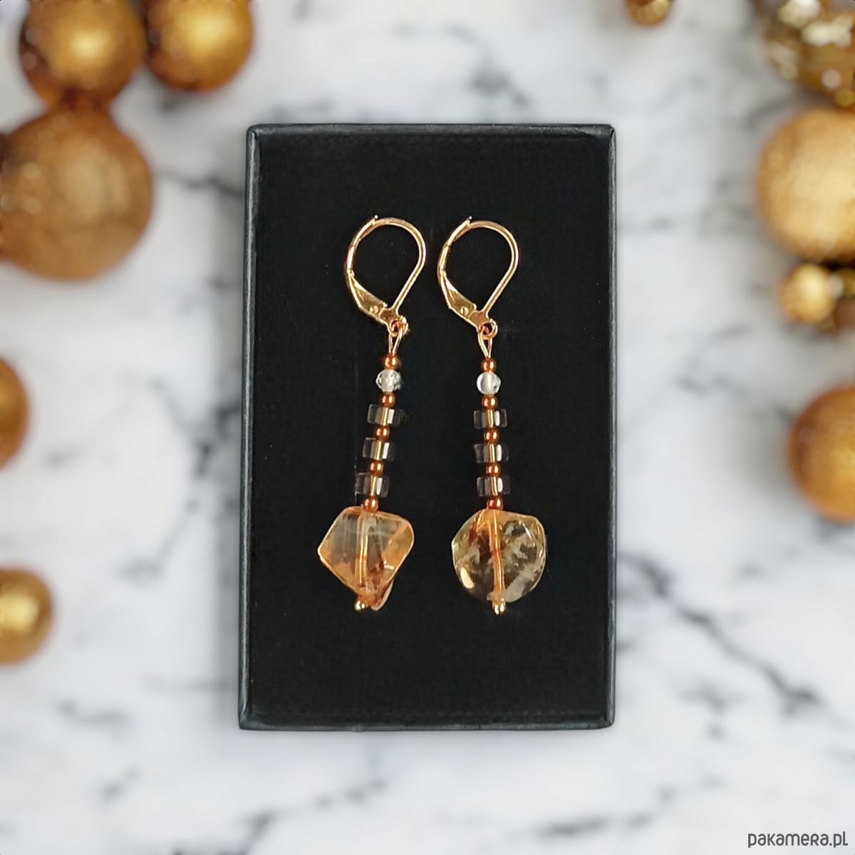 Zjawiskowe kolczyki wykonane z nieregularnych, polerowanych bryłek cytrynu (ok. 13x13mm), plasterków kwarcu dymnego (ok. 5mm) oraz fasetowanych kul kryształu górskiego (3mm) i przekładek ze złotego hematytu.