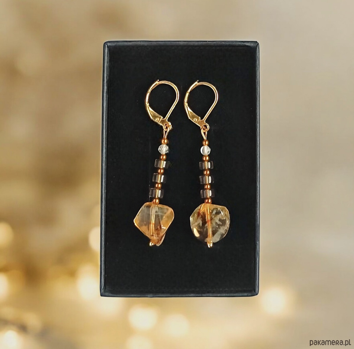 Zjawiskowe kolczyki wykonane z nieregularnych, polerowanych bryłek cytrynu (ok. 13x13mm), plasterków kwarcu dymnego (ok. 5mm) oraz fasetowanych kul kryształu górskiego (3mm) i przekładek ze złotego hematytu.