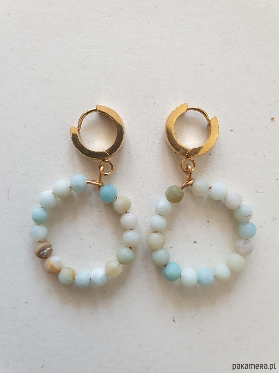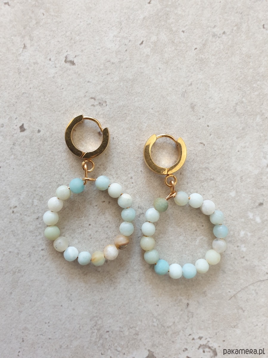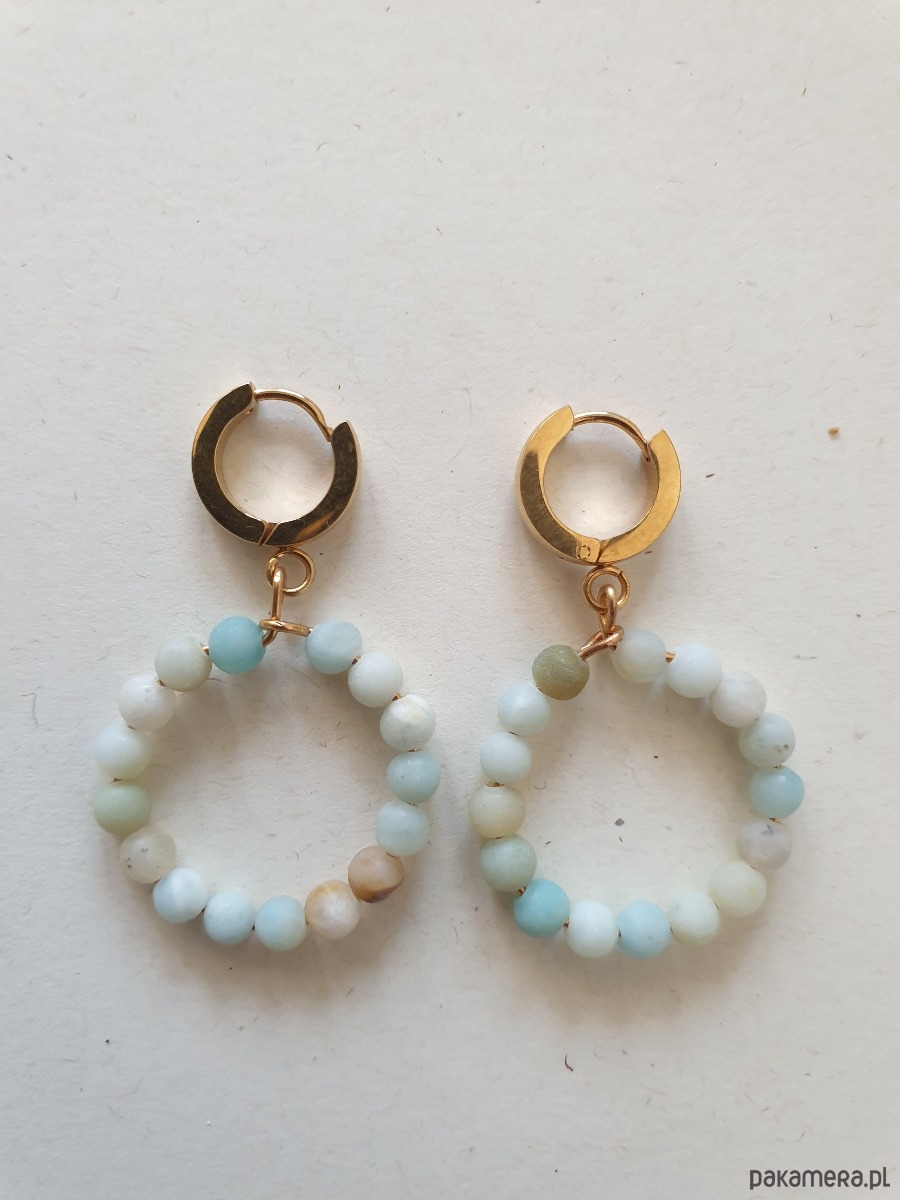 Kolczyki kółka z kolekcji DONUTS. Proste, eleganckie kolczyki i bardzo lekkie ze stali szlachetnej w kolorze złotym z kamieniami naturalnymi: amazonitem, idealne na wieczorne wyjście, ślub, ale też na co dzień.