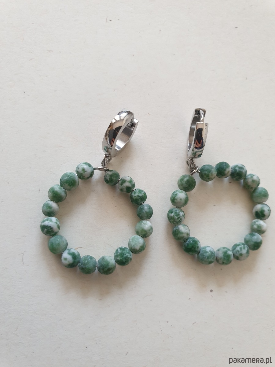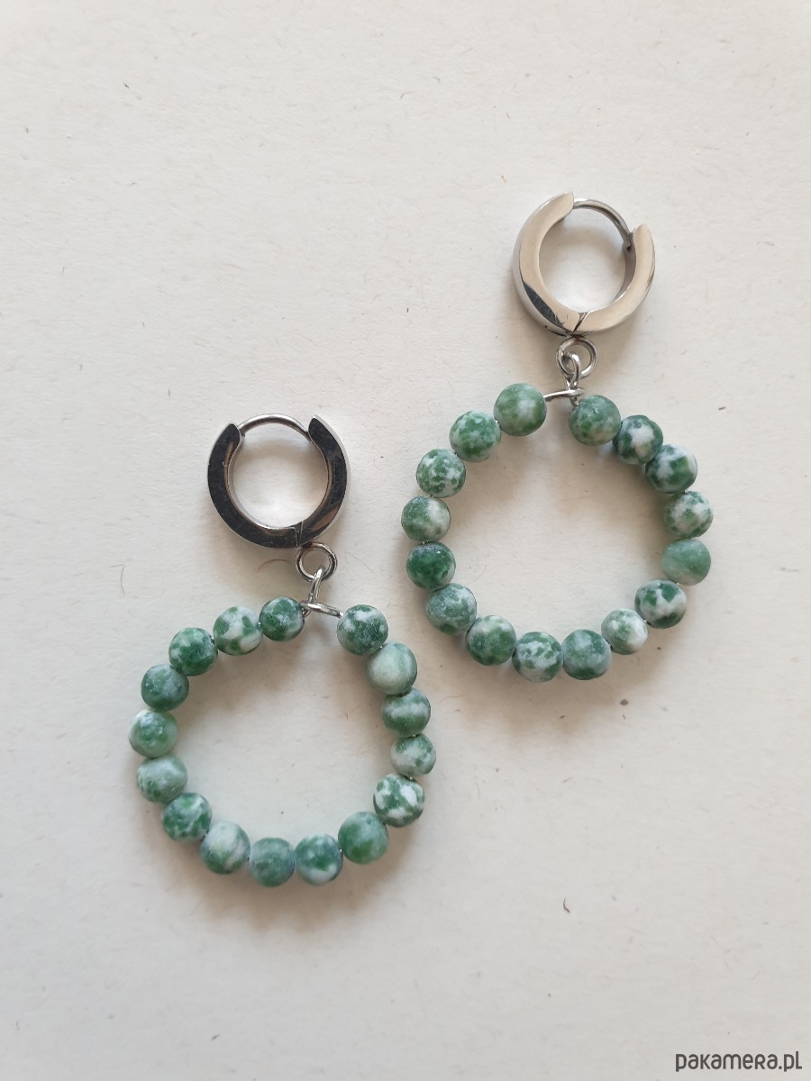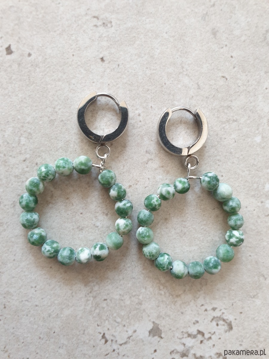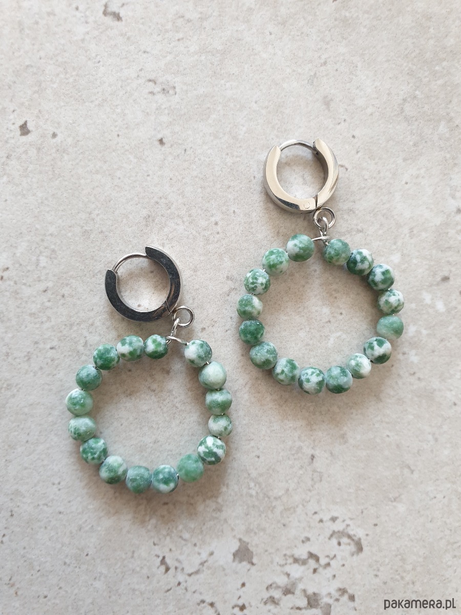 Kolczyki kółka z kolekcji DONUTS. Proste, eleganckie kolczyki i bardzo lekkie ze stali szlachetnej z kamieniami naturalnymi: jaspisem żyłkowym zielonym, idealne na wieczorne wyjście, ślub, ale też na co dzień.