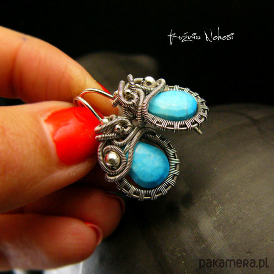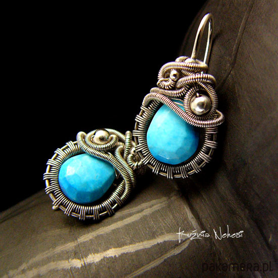 Dragony tak bardzo lubiane. Wykonane metodą wire wrapping eleganckie kolczyki które pomimo swoich niewielkich rozmiarów (27x14 mm ) z pewnością przyciągną spojrzenia. Kolczyki stworzyłam w całości ze srebra które następnie oksydowałam i wypolerowałam na wysoki połysk - ten zabieg dodał im antycznego charakteru i uwidocznił spiralki. Sercem kolczyków są dwie briolety cudownego naturalnego Turkusu Sleeping Beauty. Każdy element został wykonany przeze mnie własnoręcznie z największą precyzją, kolczyki są bardzo wygodne, sama takie noszę a mam wymagające uszy. Turkus jest minerałem który chroni podróżnych, wspomaga odwagę jest wielofunkcyjnym uzdrawiaczem ciała. Dobrze wpływa na duchowość, spokój umysłu. Polecam © Nehesi Design