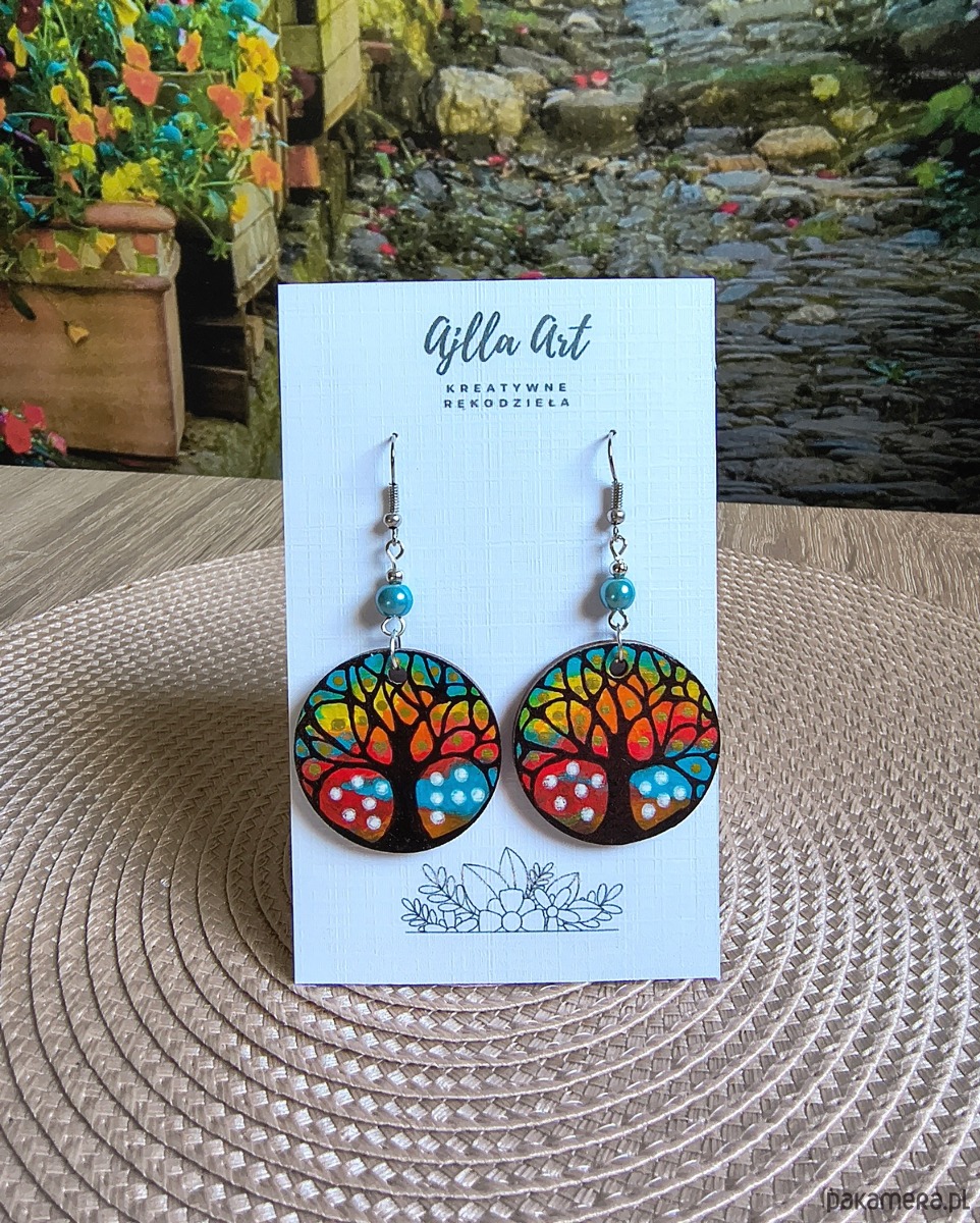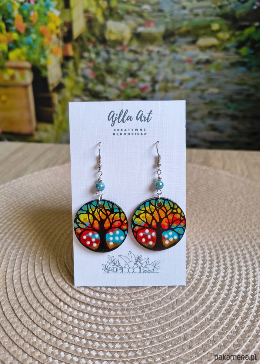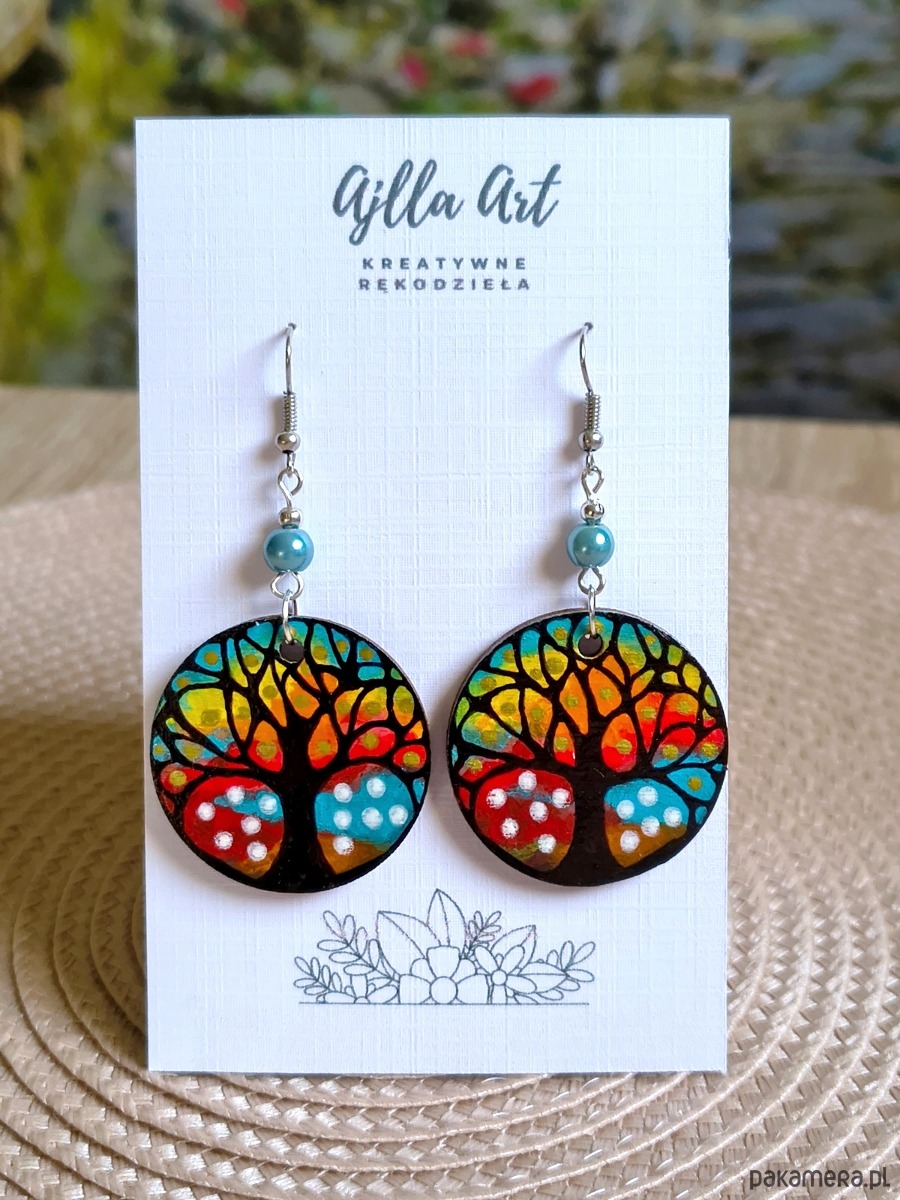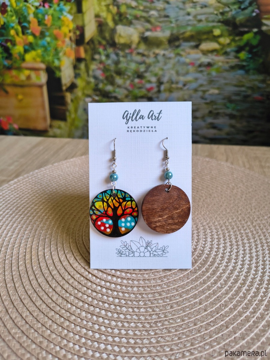 Lekkie kolczyki drewniane ręcznie malowane farbami akrylowymi z motywem drzewa.