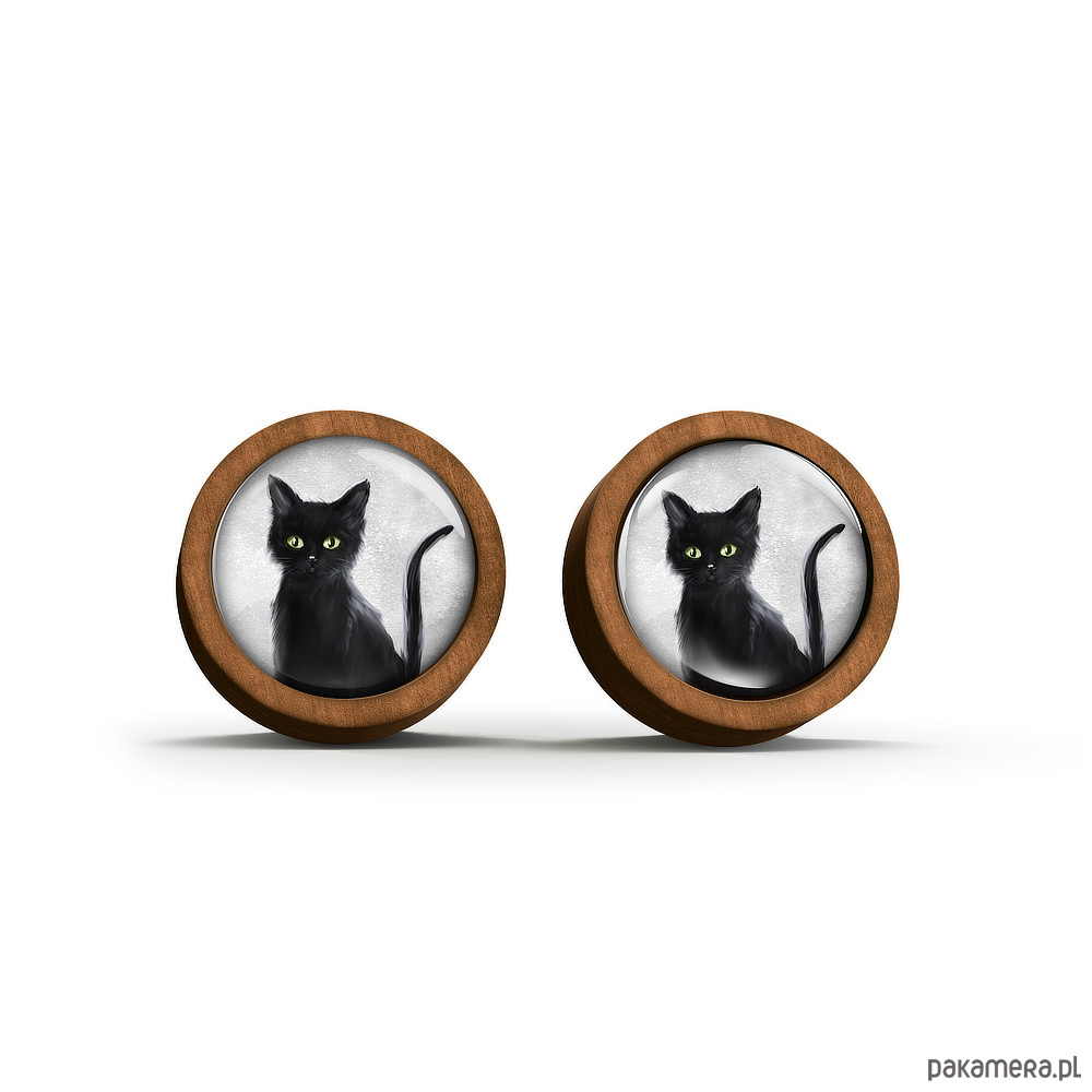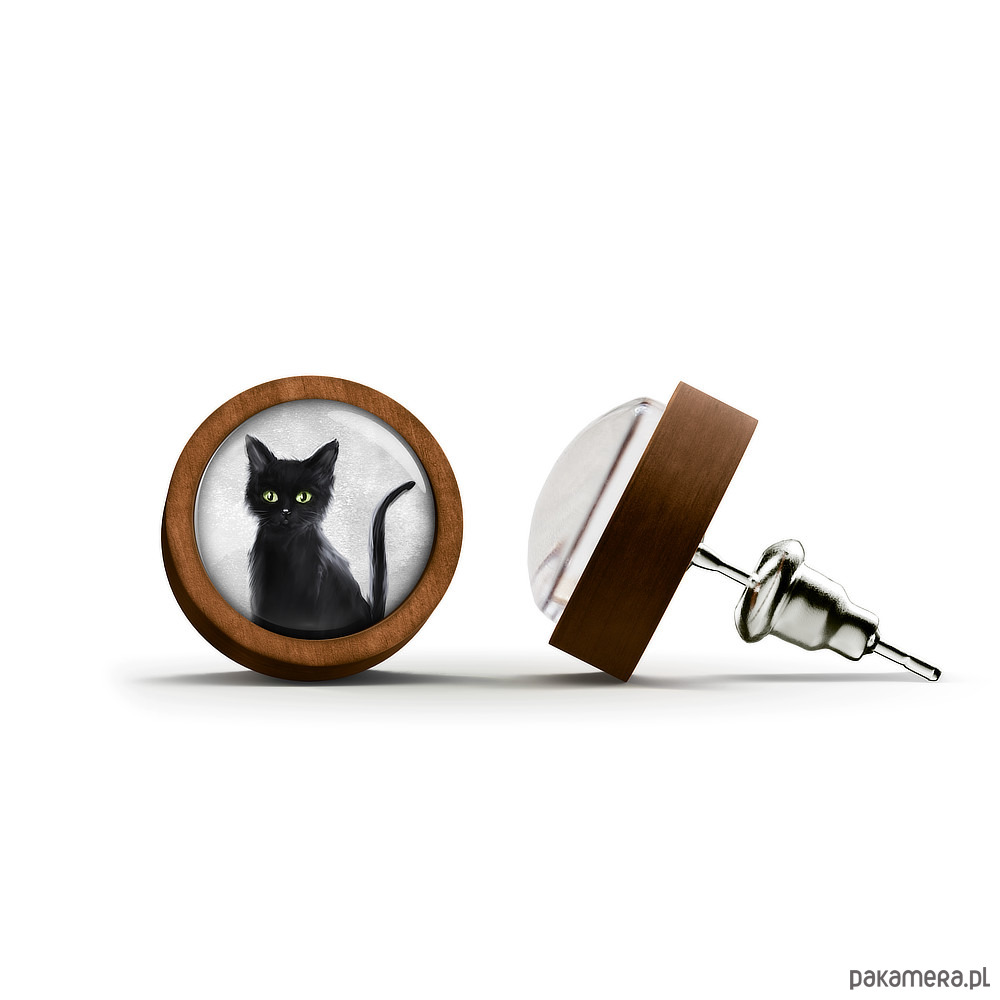 Kolczyki drewniane - Czarny kot - sztyfty
