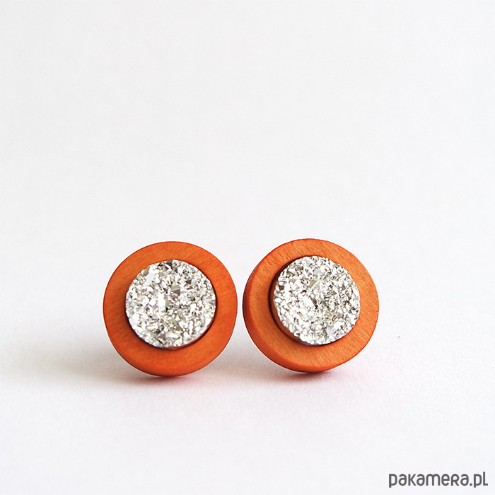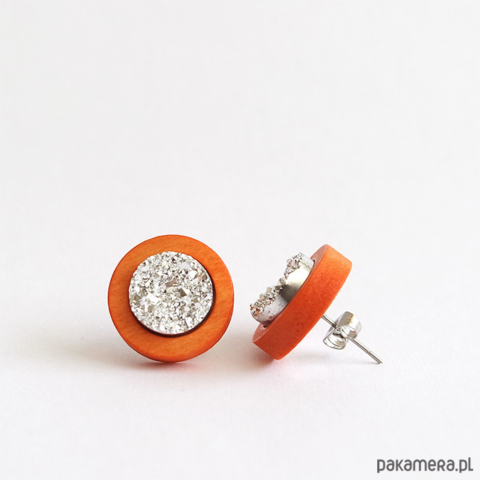 Kolczyki drewniane - Druzy srebrne - sztyfty