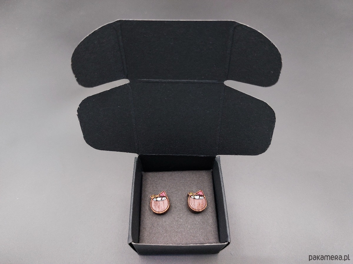 Kolczyki pakuję w kartonowe pudełeczko widoczne na zdjęciu.