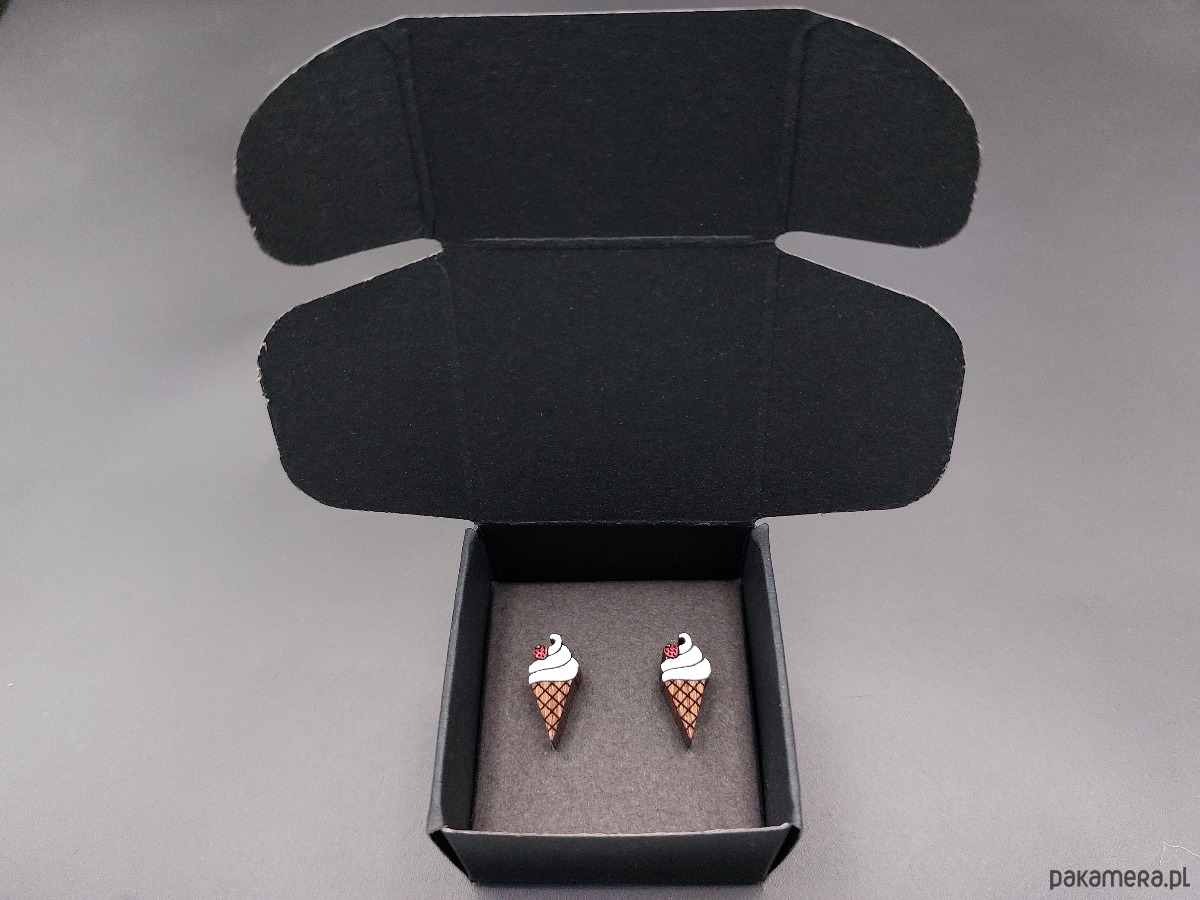 Kolczyki pakuję w kartonowe pudełeczko widoczne na zdjęciu.