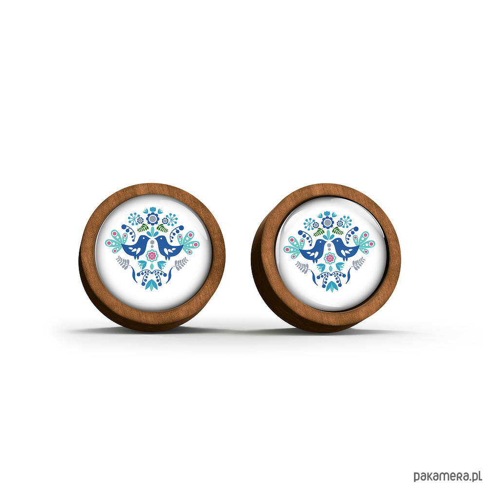 Kolczyki drewniane - Ptaszki folk, blue - sztyfty