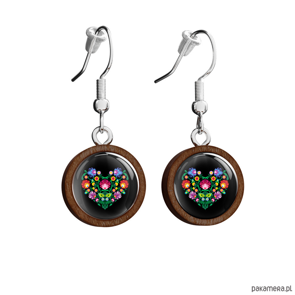Kolczyki drewniane - Serce folkowe czarne - wiszące