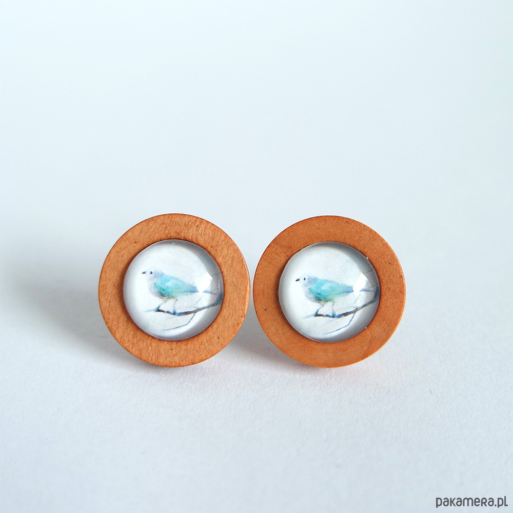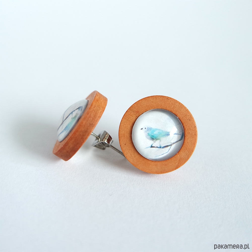 Kolczyki drewniane - Turkusowy ptak - sztyfty