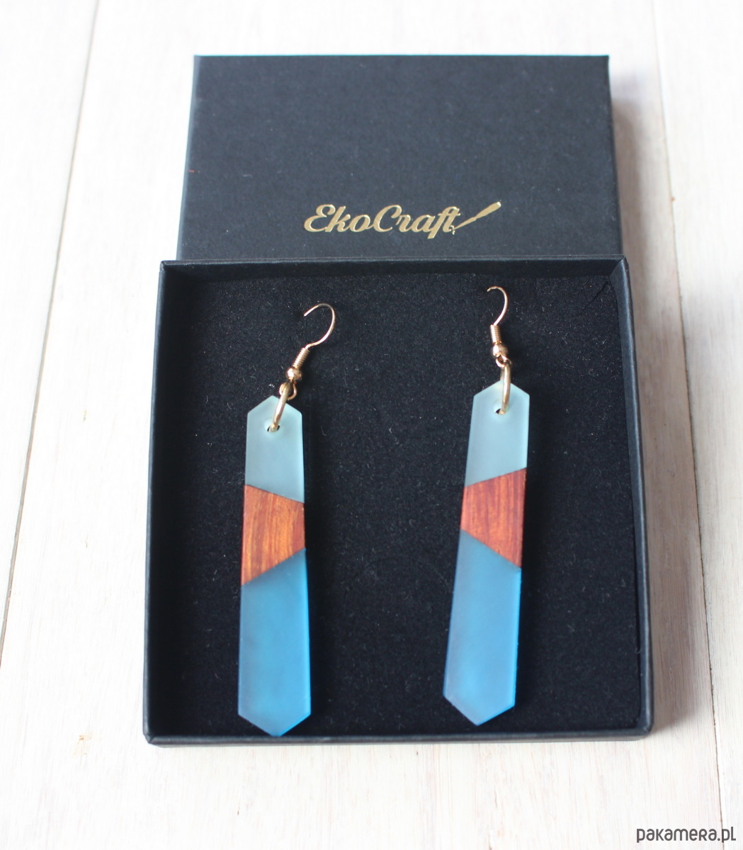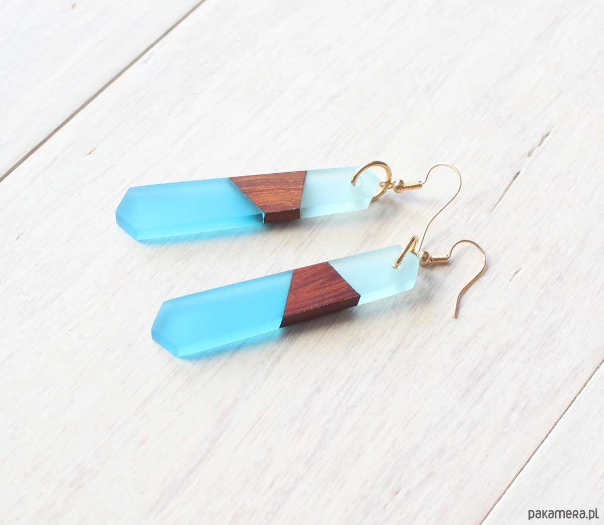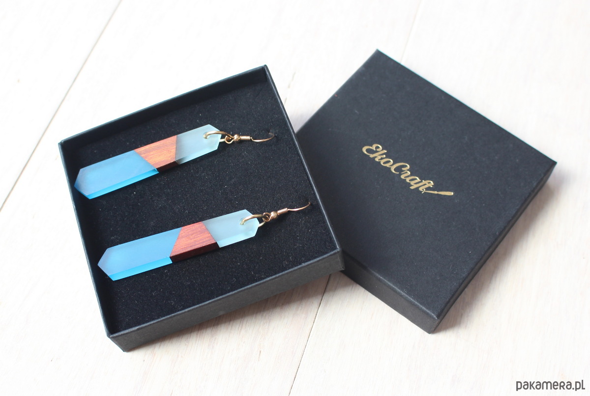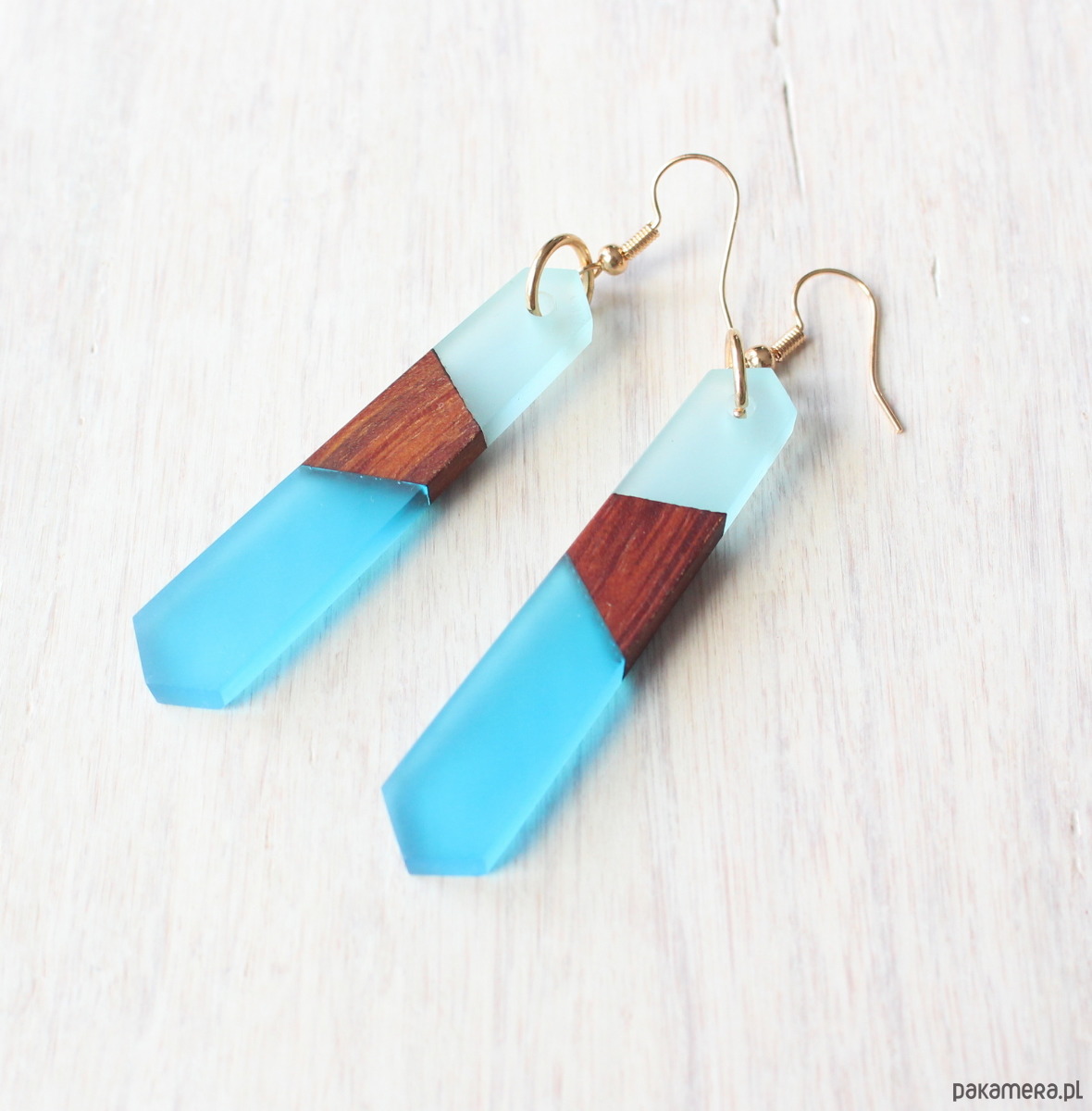 Ekologiczne drewniane kolczyki, prezentujące innowacyjne połączenie egzotycznego drewna merbau oraz matowej żywicy epoksydowej w niebieskim i błekitnym kolorze.