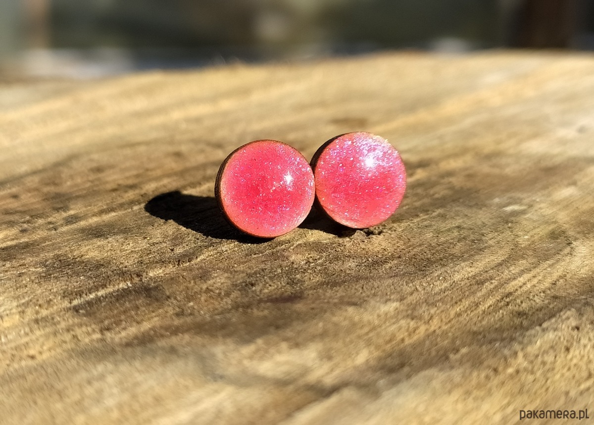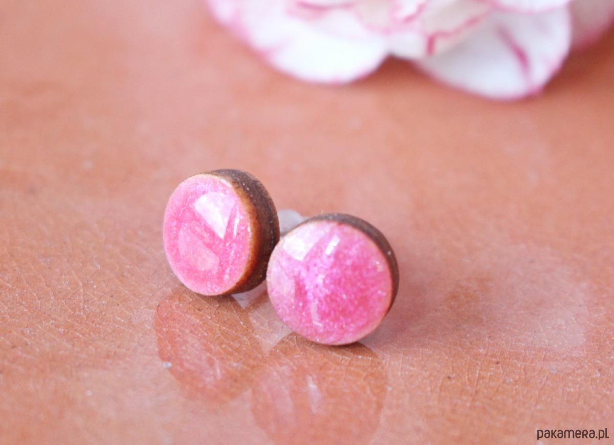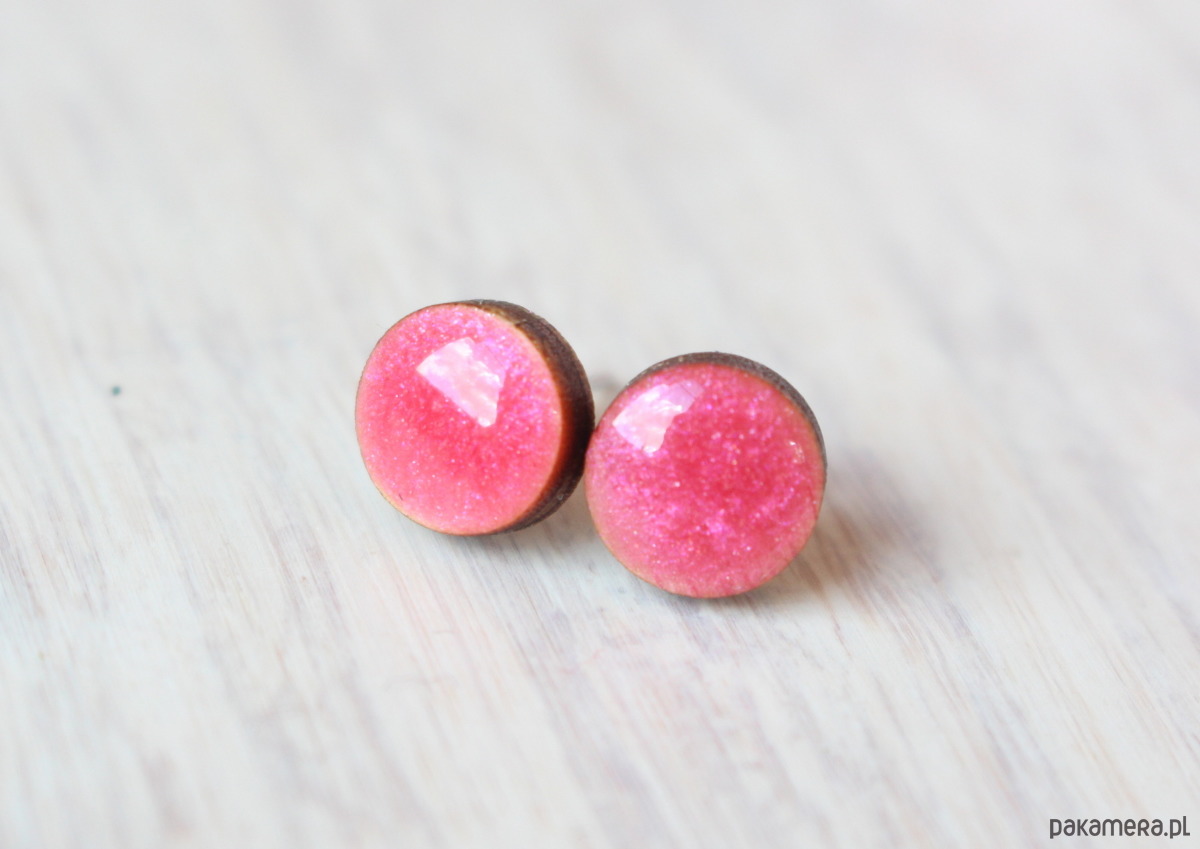 Ekologiczne, oryginale kolczyki - sztyfty wykonane z drewna brzozowego (sklejka), ręcznie pokrytego cukierkowo różową żywicą epoksydową.