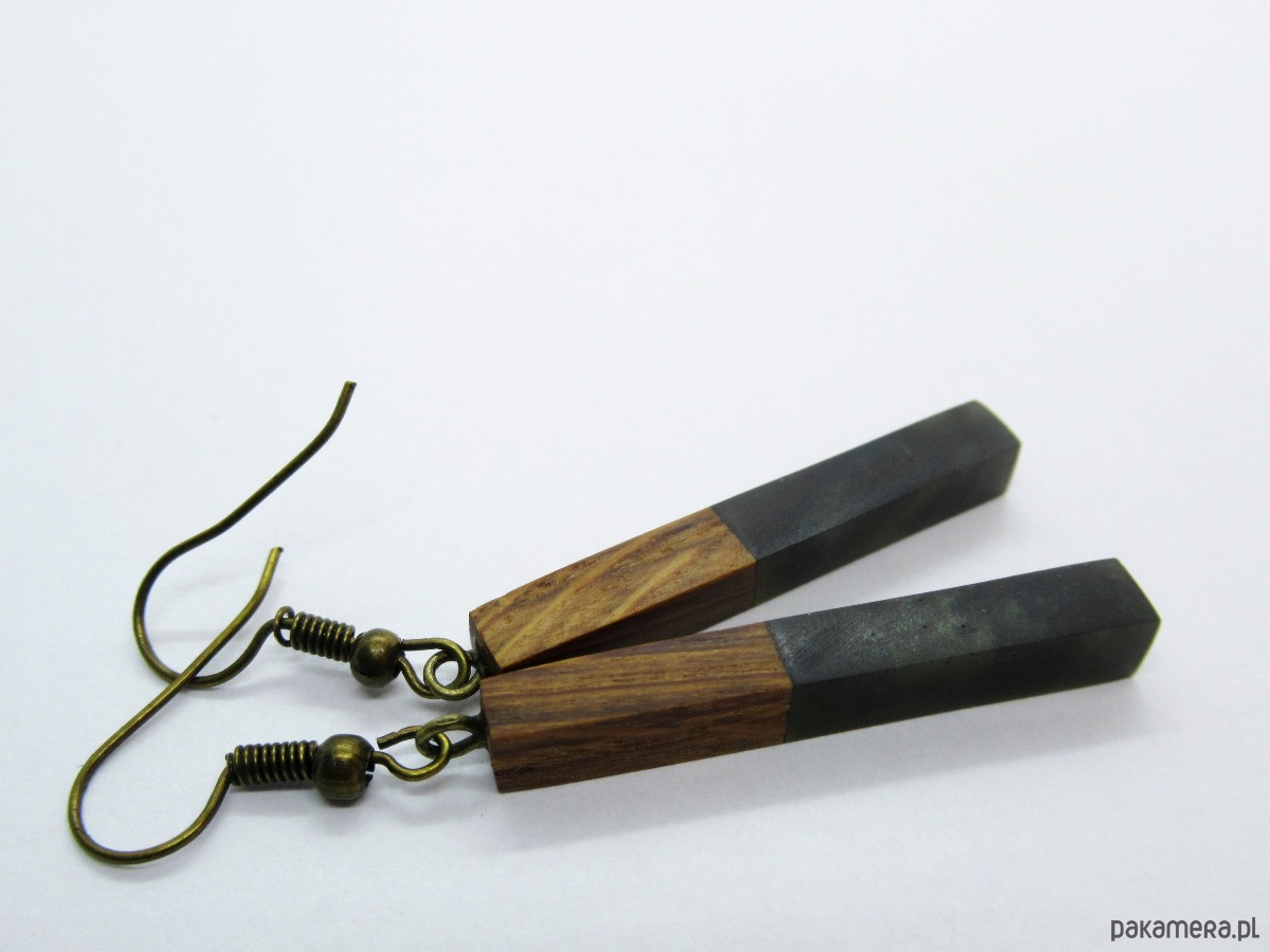 Kolczyki wykonane z drewna dębowego w połączeniu z czarną żywica, zaimpregnowane naturalnymi olejami lnianymi. Pakowane w EKO pudełeczko. Bigle wykonane ze stali chirurgicznej - nie uczulają!