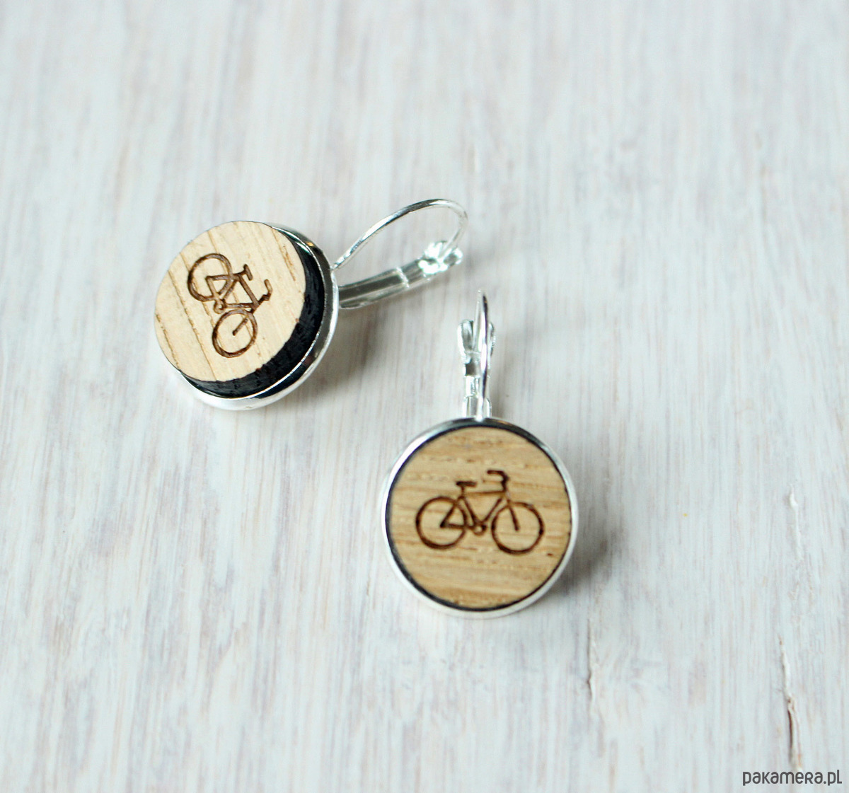 Średnica drewnianego elementu 1,6 cm, grubość drewnianej warstwy wynosi 4 mm. Kolczyki na metalowej bazie z ramką, o długości całkowitej około 3 cm.