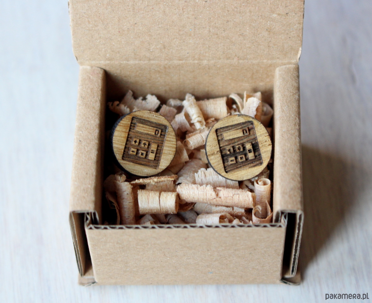 Na kolczykach grawer przedstawiający kalkulator.