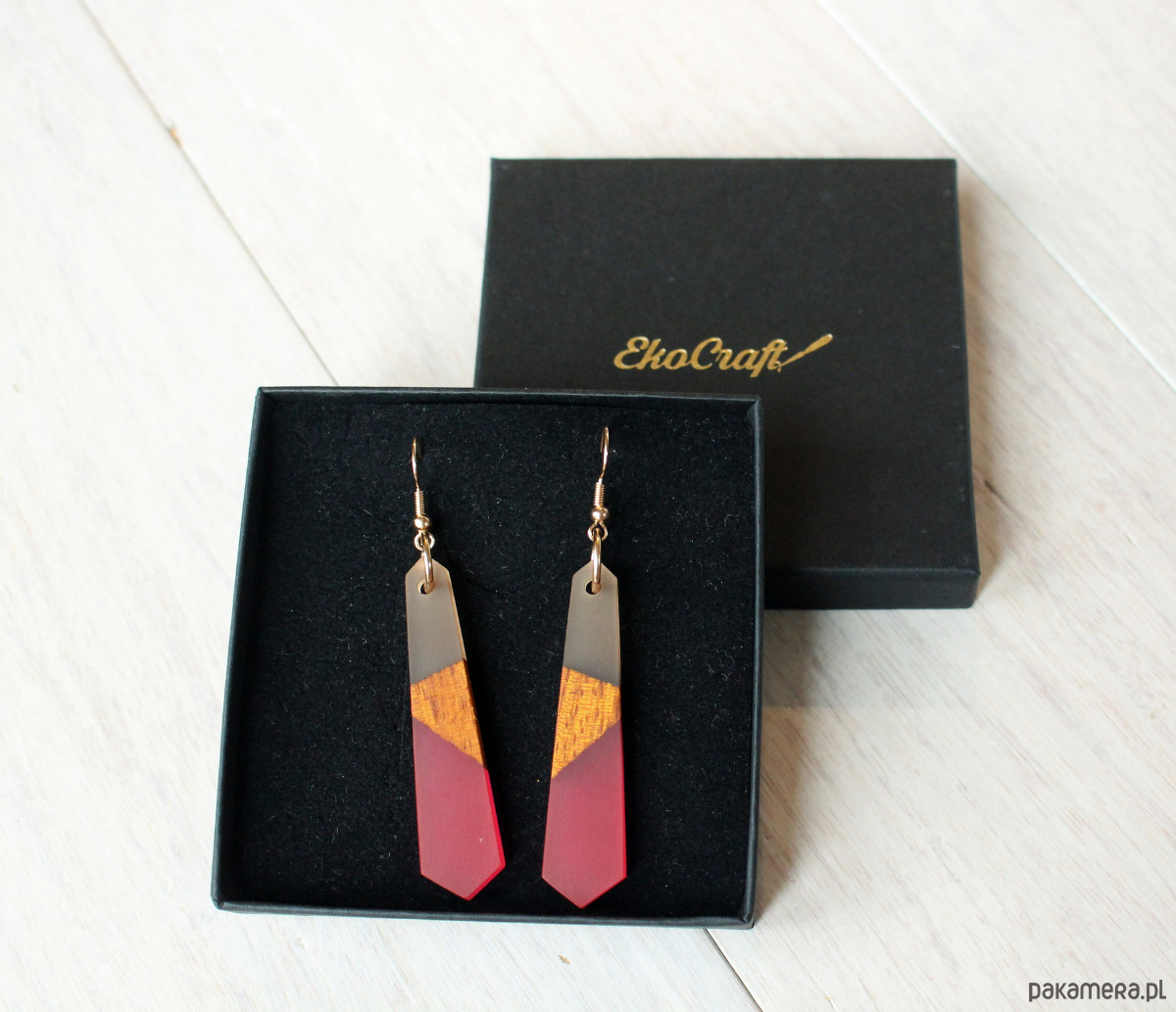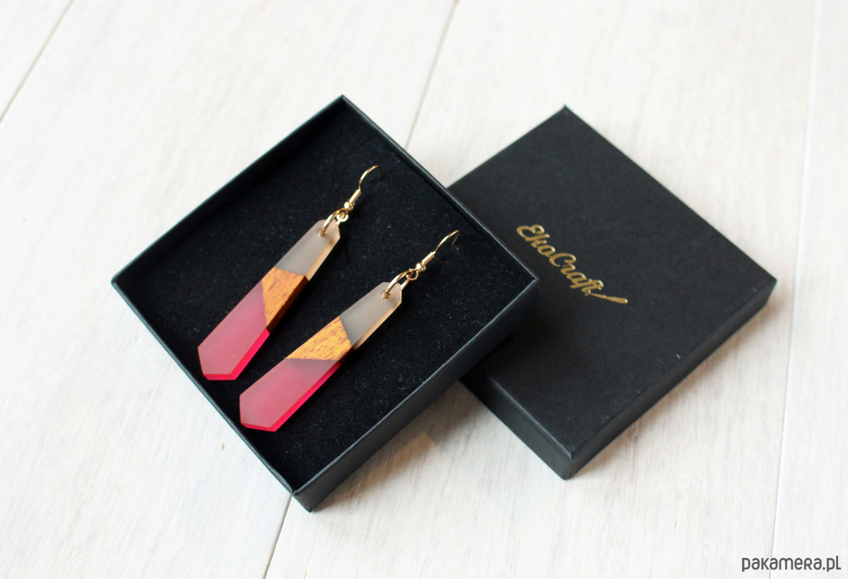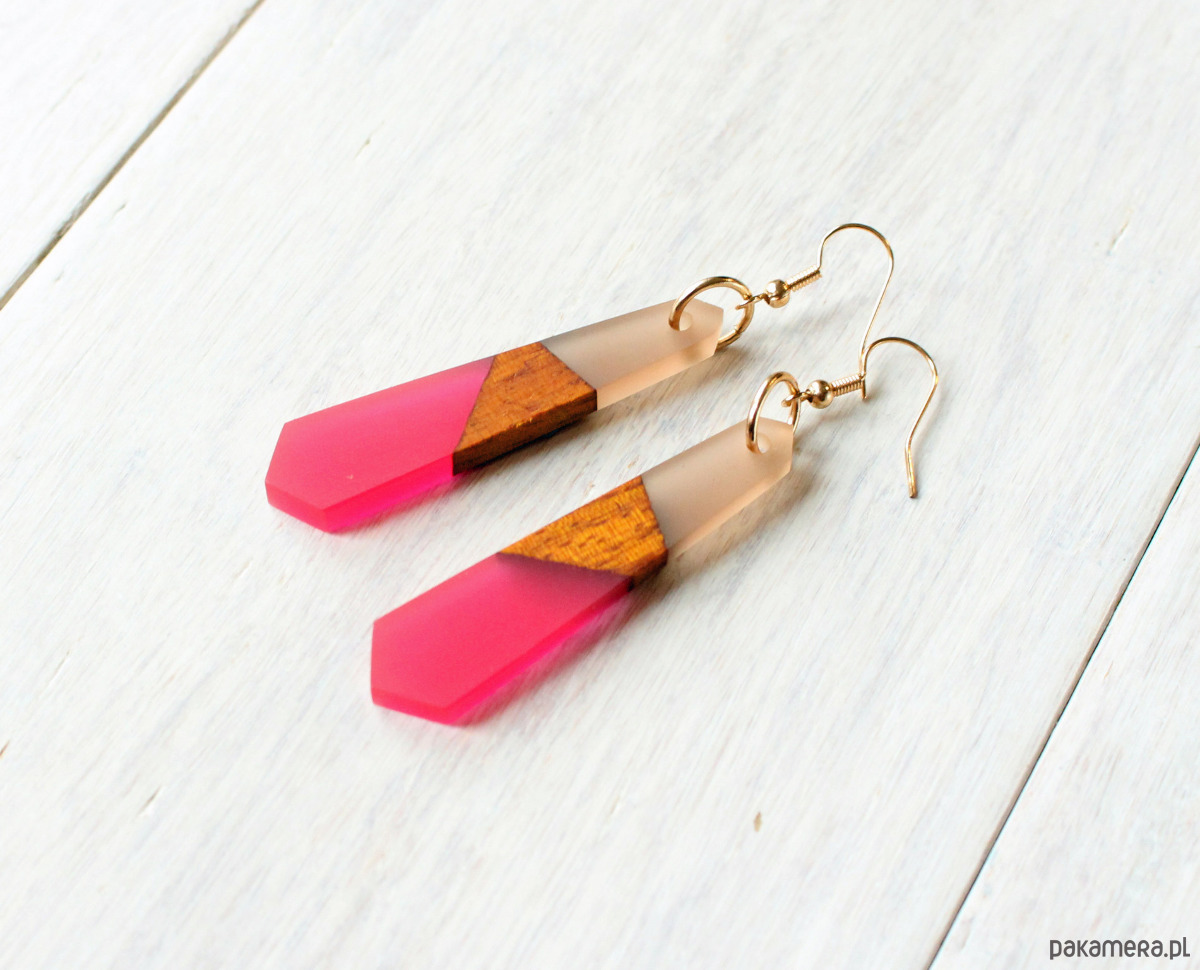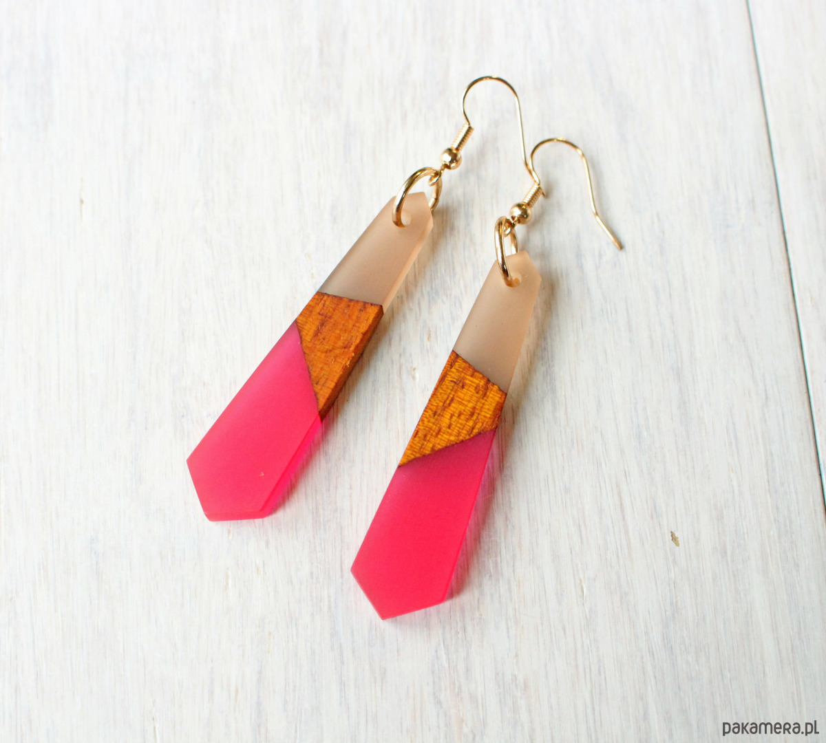 Ekologiczne drewniane kolczyki, prezentujące innowacyjne połączenie egzotycznego drewna merbau oraz matowej żywicy epoksydowej w żółto-różowym kolorze.