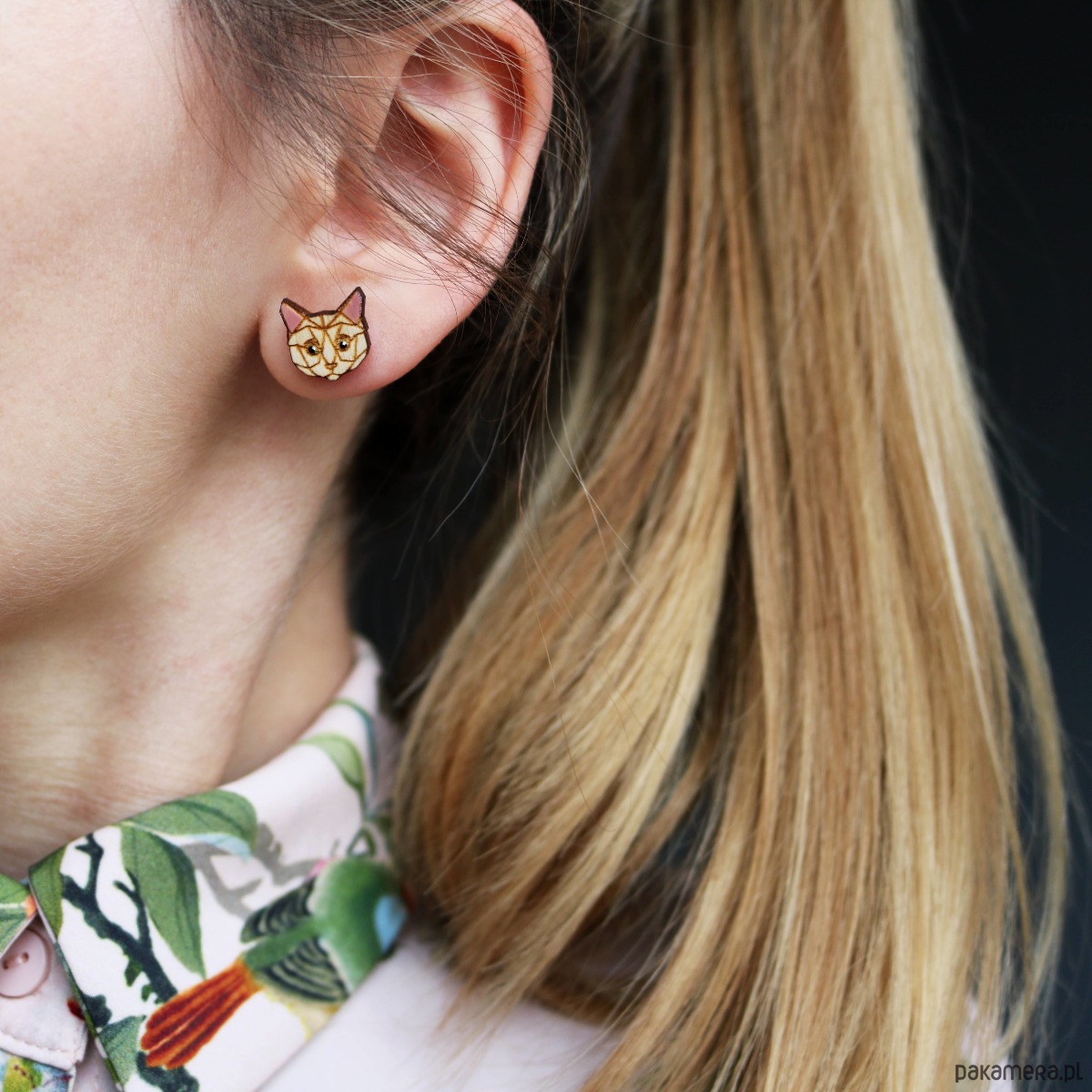 Przedstawiam urocze kolczyki koty wykonane z drewna.