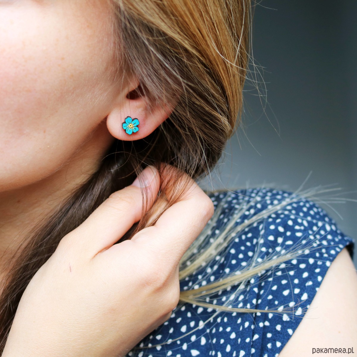 Prezentuję drewniane kolczyki w kształcie kwiatków niezapominajek.
